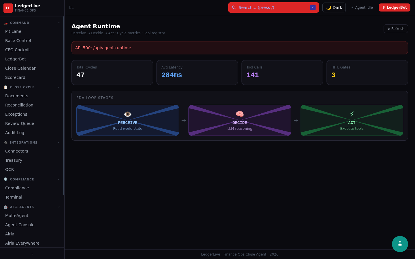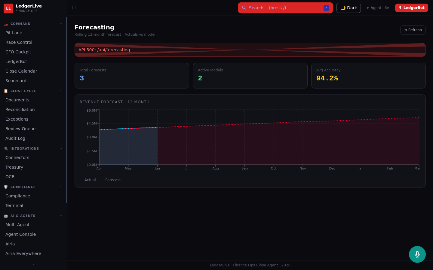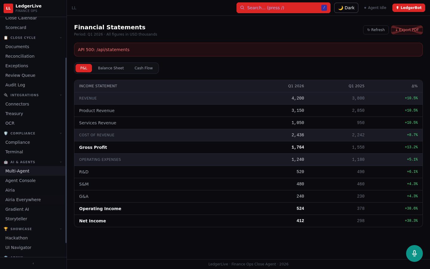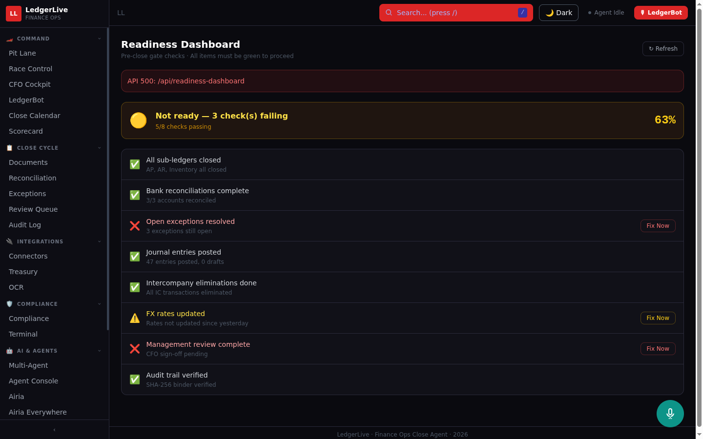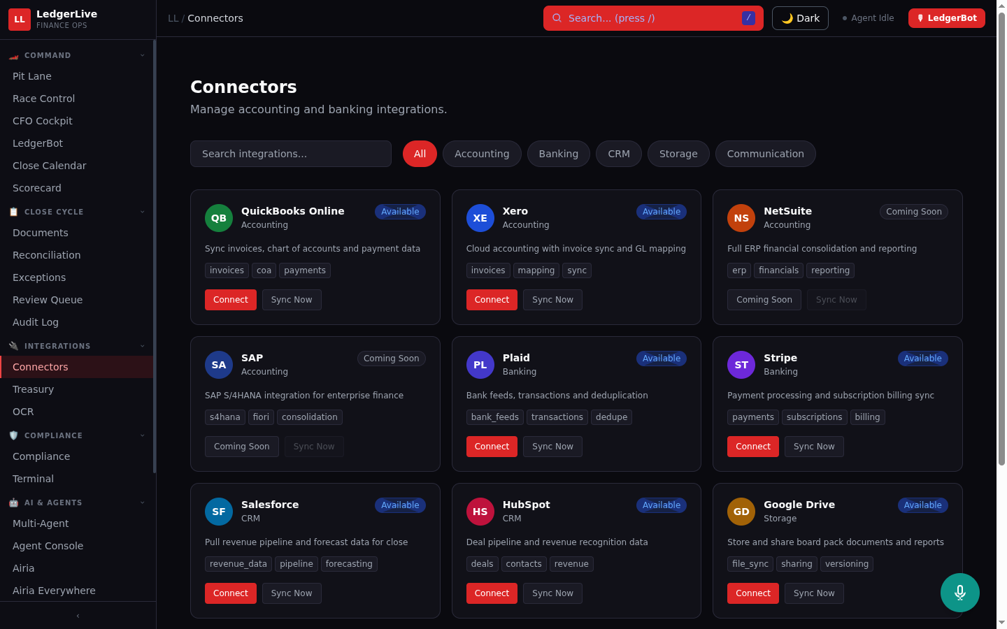 LedgerLive is an Active Agent on Airia that autonomously orchestrates the month-end financial close process across two live systems.