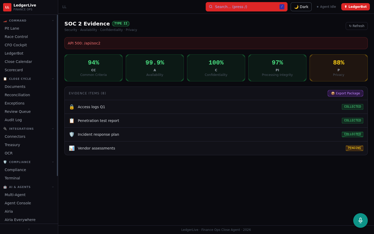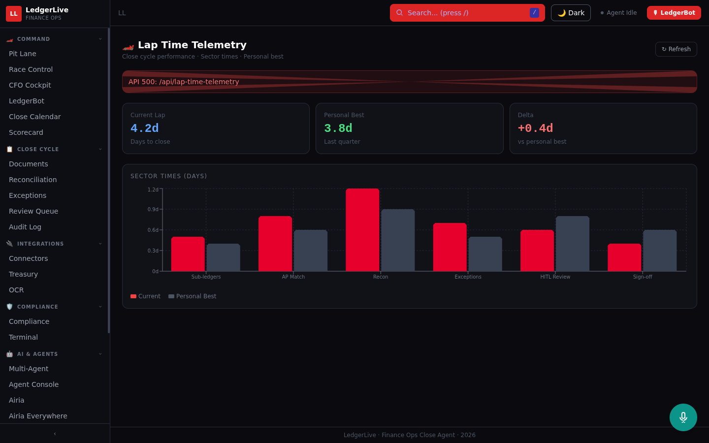 The frontend is React 18 + Vite + Tailwind with a dark F1 racing theme — because a month-end close is like a pit stop: every second counts, every person has a role, and real-time telemetry keeps everyone aligned.