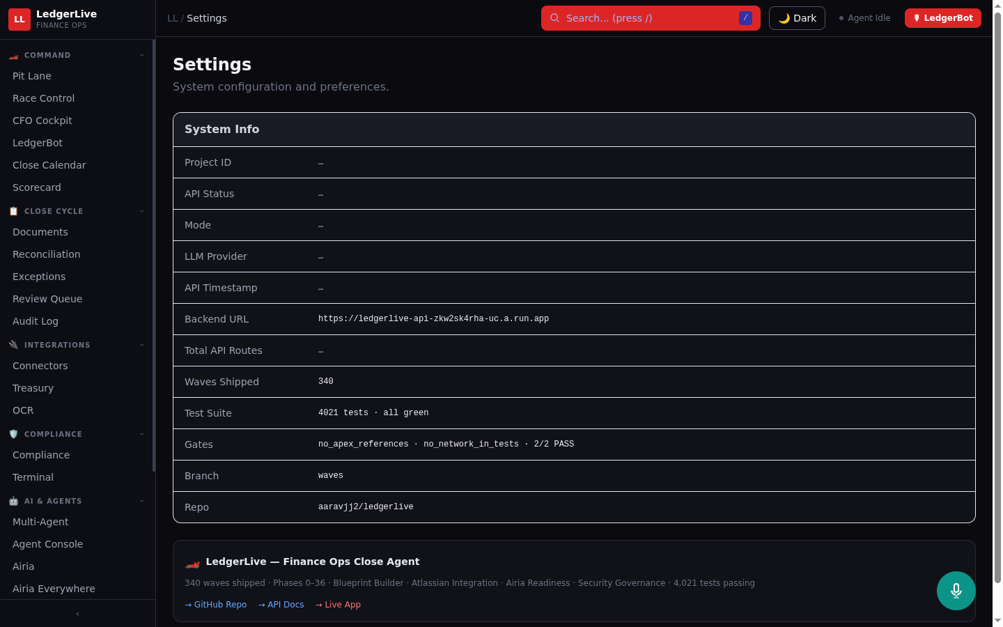 Connecting two live systems. The Airia agent calls the LedgerLive FastAPI backend to fetch data, and the FastAPI backend calls the Airia agent to process it. Getting the bidirectional integration working on Railway — with correct CORS, env vars, and timeout handling — required careful deployment sequencing.