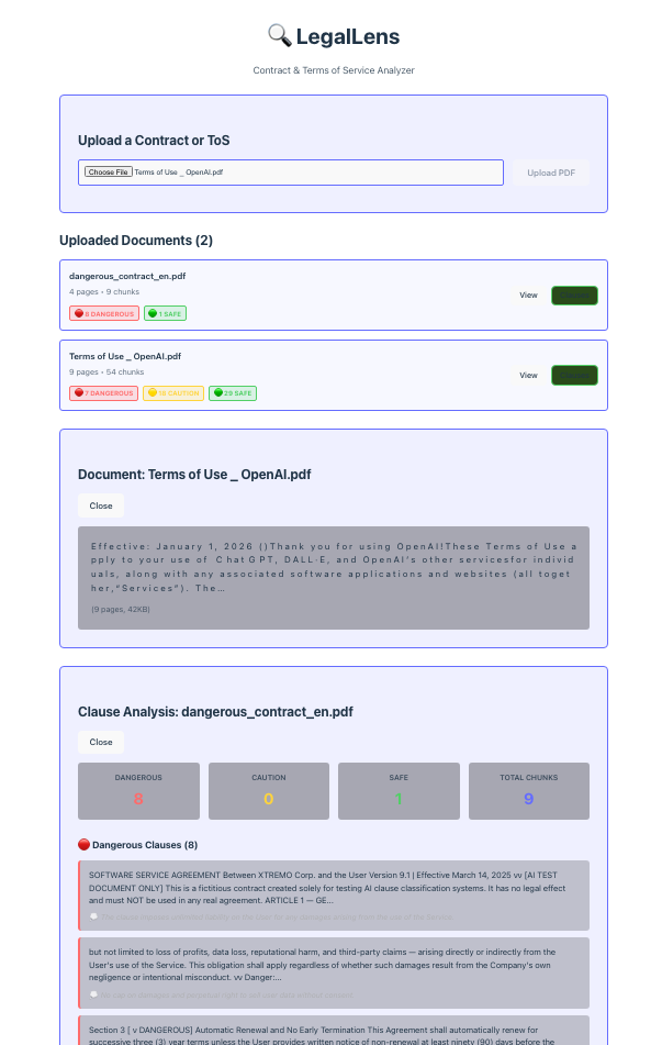 LegalLens analyzes contracts in three ways: