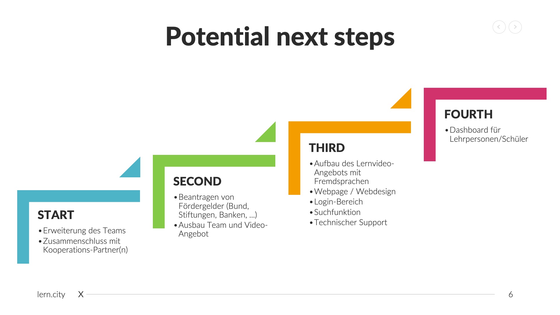 Unser Ziel ist es, unser Lernvideo-Angebot weiter auszubauen und Kooperationspartner sowie finanzielle Unterstützung für unser Projekt zu finden. Weiter möchten wir die Videos gerne in andere Sprachen übersetzen, um neben der Chancengleichheit und der Corona-Unterstützung auch die Migration zu fördern.