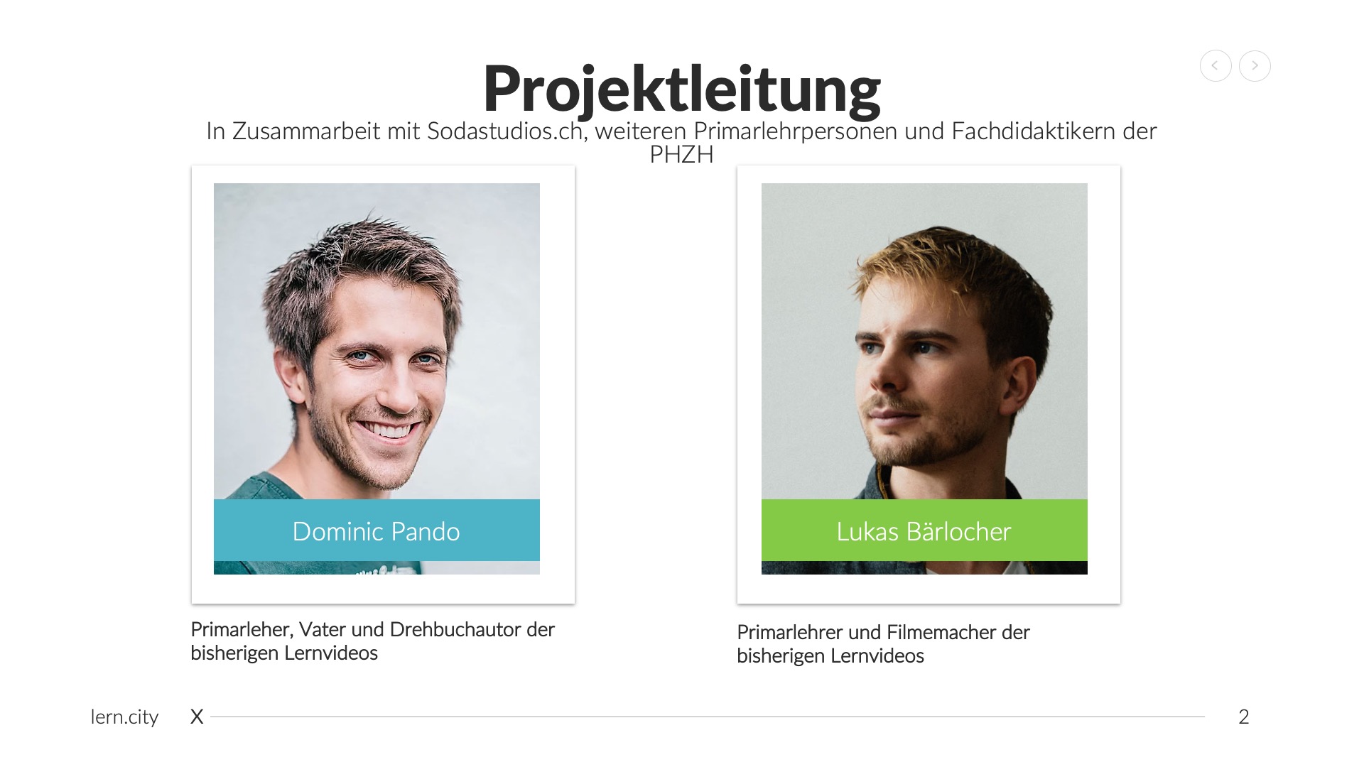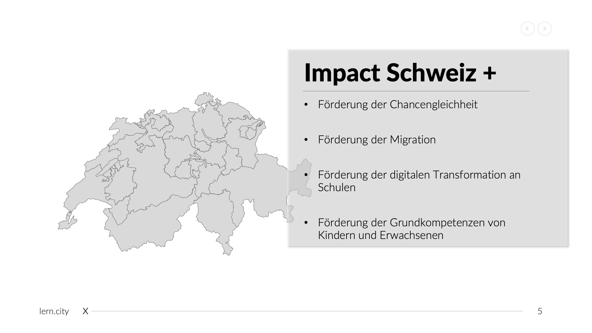 Lern.city will zum Ausgleich und zur Vergrösserung der Bildungschancen aller Schülerinnen und Schüler der Schweiz künftig einen relevanten Beitrag leisten. Mit einer qualitativ hochstehenden, mehrsprachigen, digitalen Lernplattform, welche mit dem Lehrplan 21 konform ist, will Lern.City den effizienten Wissenstransfer fördern. In erster Priorität sollen für die Fachbereiche Mathematik und Deutsch ansprechende und lernfördernde Angebote (v.a. interaktive Lernvideos) angeboten werden.