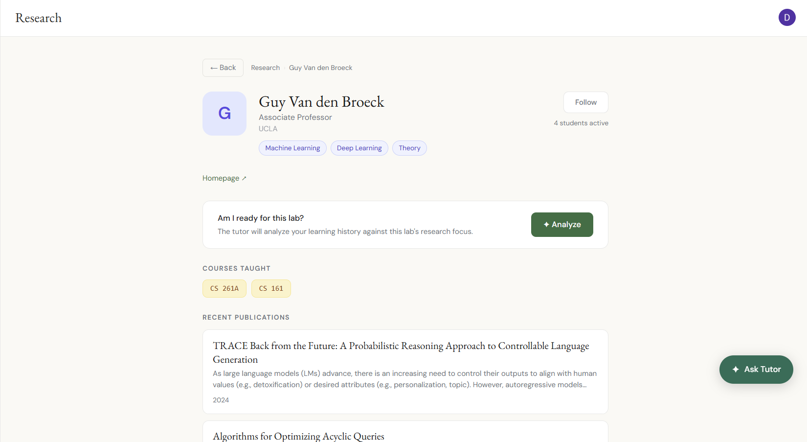 - Real academic data, not seeded mock data. Papers are pulled live from the ArXiv API. UCLA faculty (12 professors, 153 papers) are seeded from Semantic Scholar. Field readiness percentages are computed in real time against the user's mastered concepts.