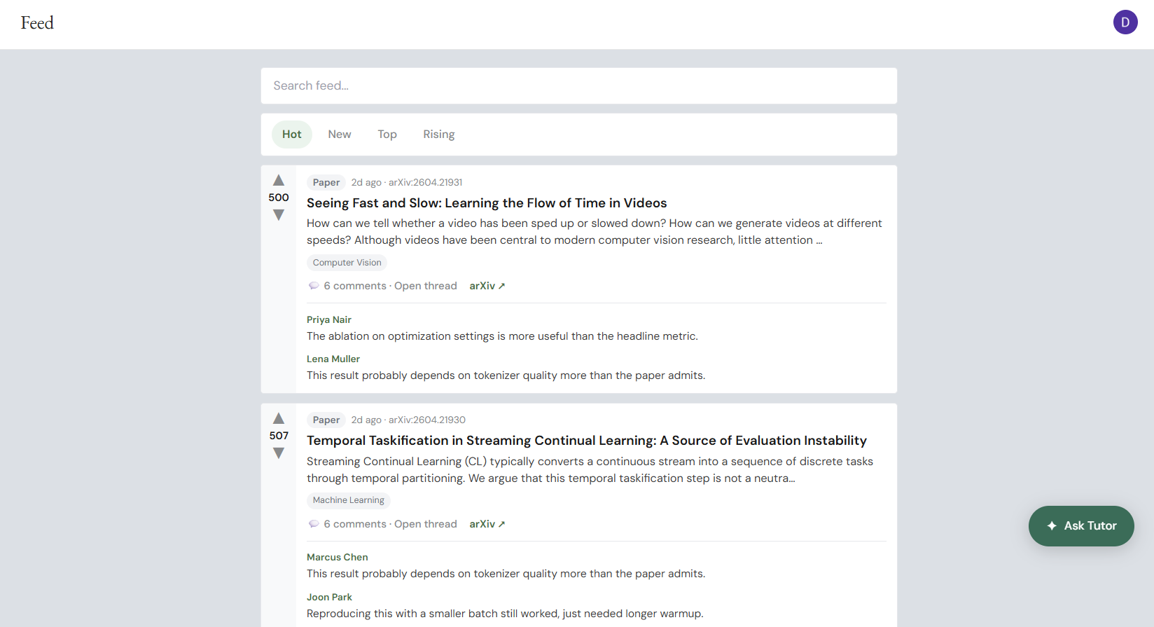 - A personalized tutor with persistent memory. A separate ASI1-powered chat that loads the user's full context — completed concepts, field interests, recently reviewed papers — into the system prompt on every message. Chat history is stored per-user in MongoDB so conversations persist across sessions. Any page in the app can open the tutor with a pre-filled prompt by dispatching a custom event, which is how features like "Analyze Professor" surface contextual guidance without coupling the tutor to specific pages.