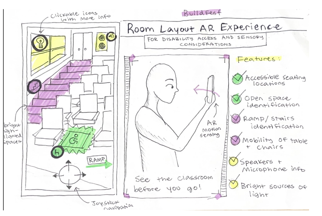 We're most proud of our technical accomplishment of taking an actual room at the DMC and adding digital features to it. We think this combination of real and digital add-ons mimics the behavior of AR tools, but in a VR environment for someone who may not be able to go the classroom itself. In a more broad context, we're proud of how our idea would impact communities that often go unnoticed. For example, a VR visualization of a classroom helps mobility-impaired individuals, but it also aids those with generalized anxiety disorder, so they would be more at ease after knowing exactly what their learning environment looks like. Pre-visualization, especially in VR form, is not often a tool made specifically for this community and we are proud to launch this and hopefully inspire others to keep every group within the disabled community in mind while creating technology solutions.