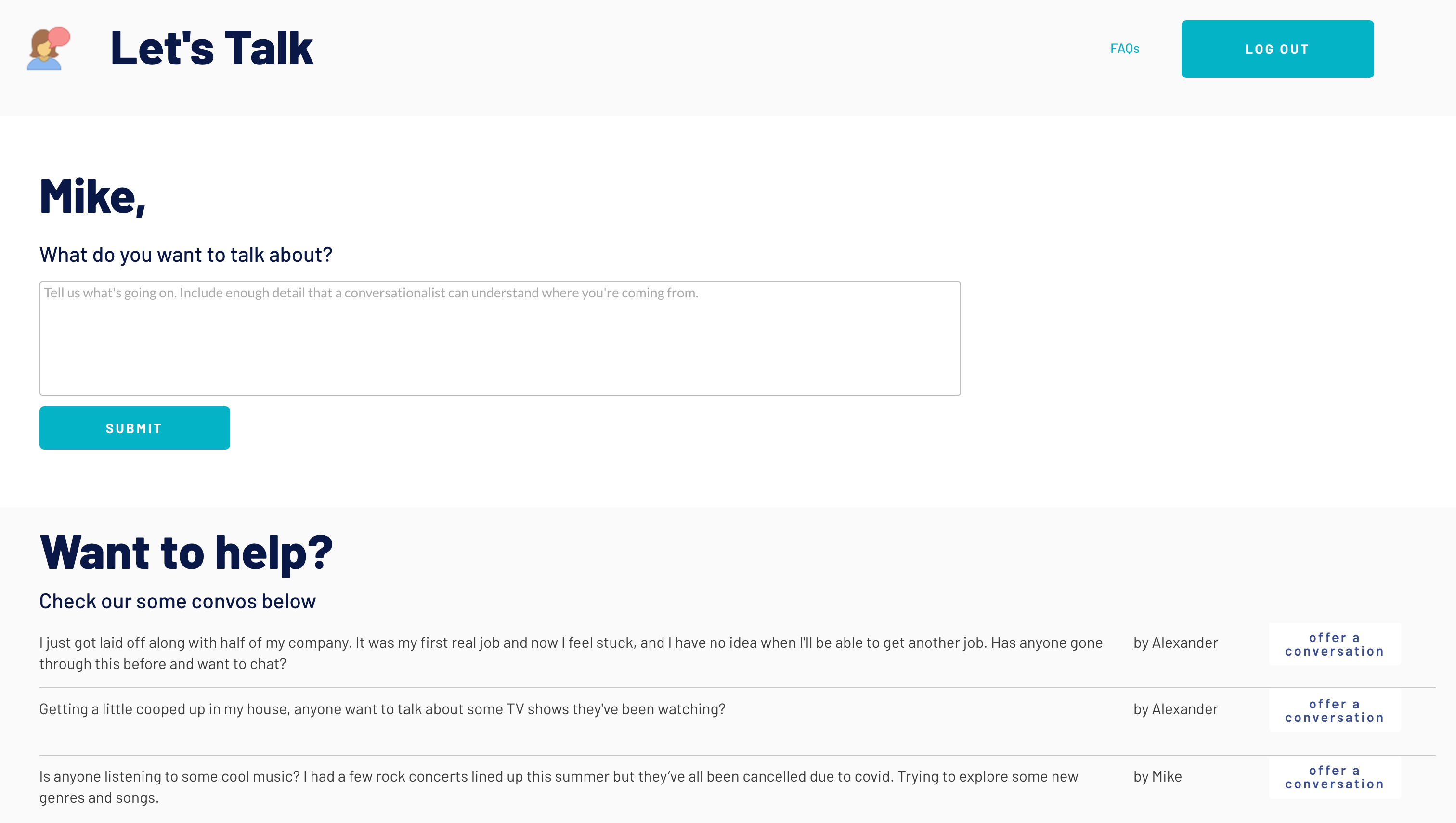 People can make an account at https://wannatalk.bubbleapps.io/ and submit a conversation topic that they'd like to discuss.