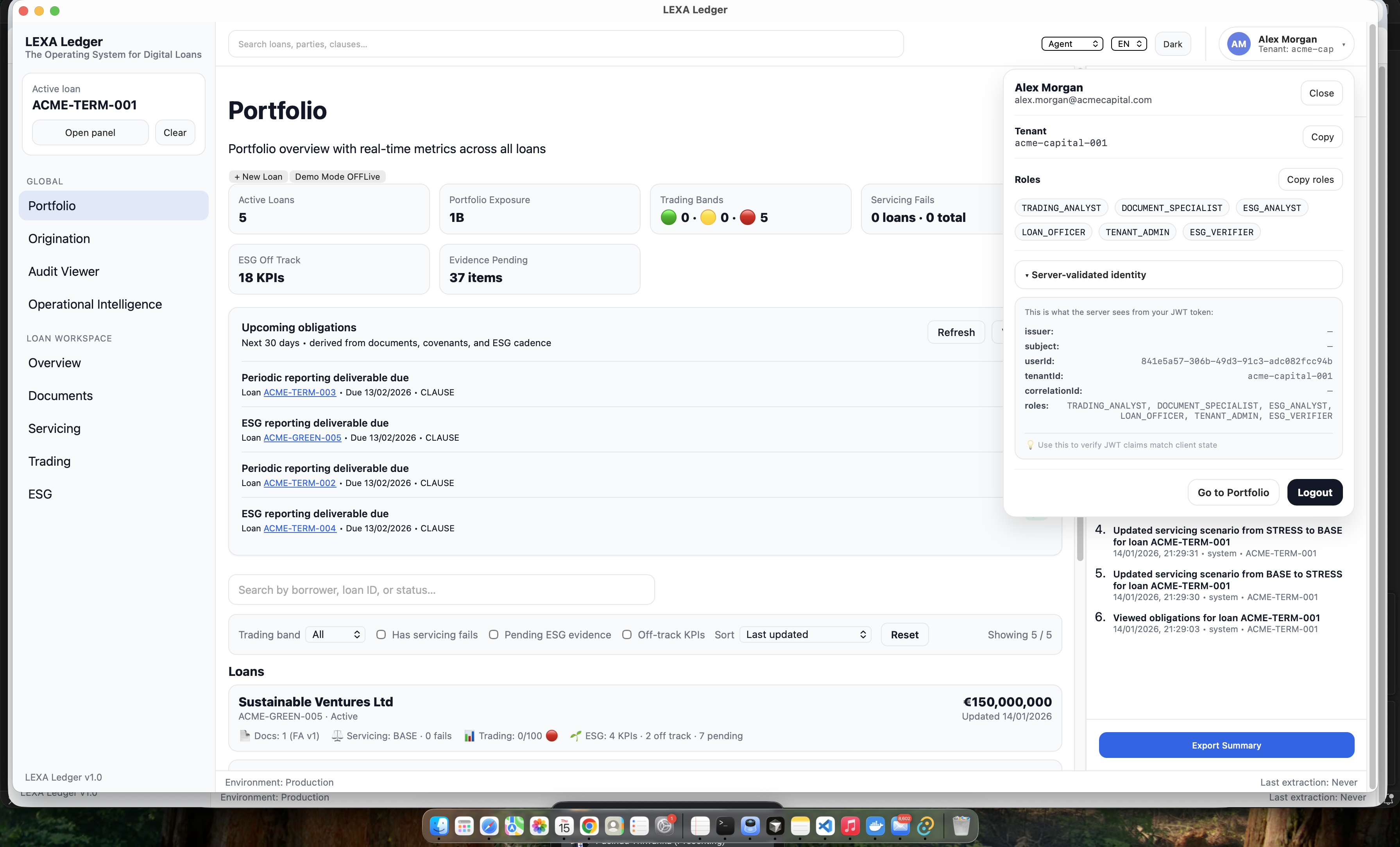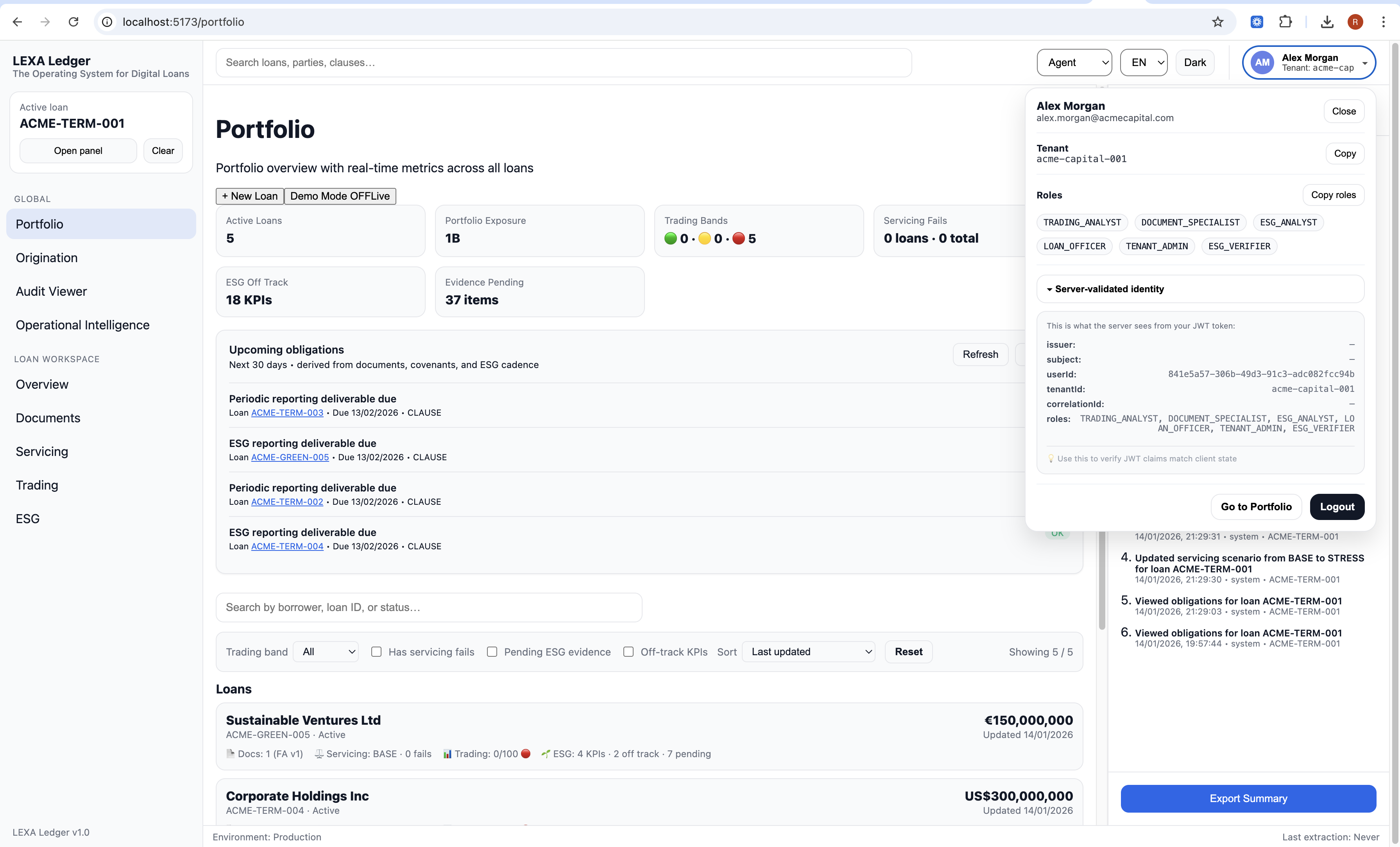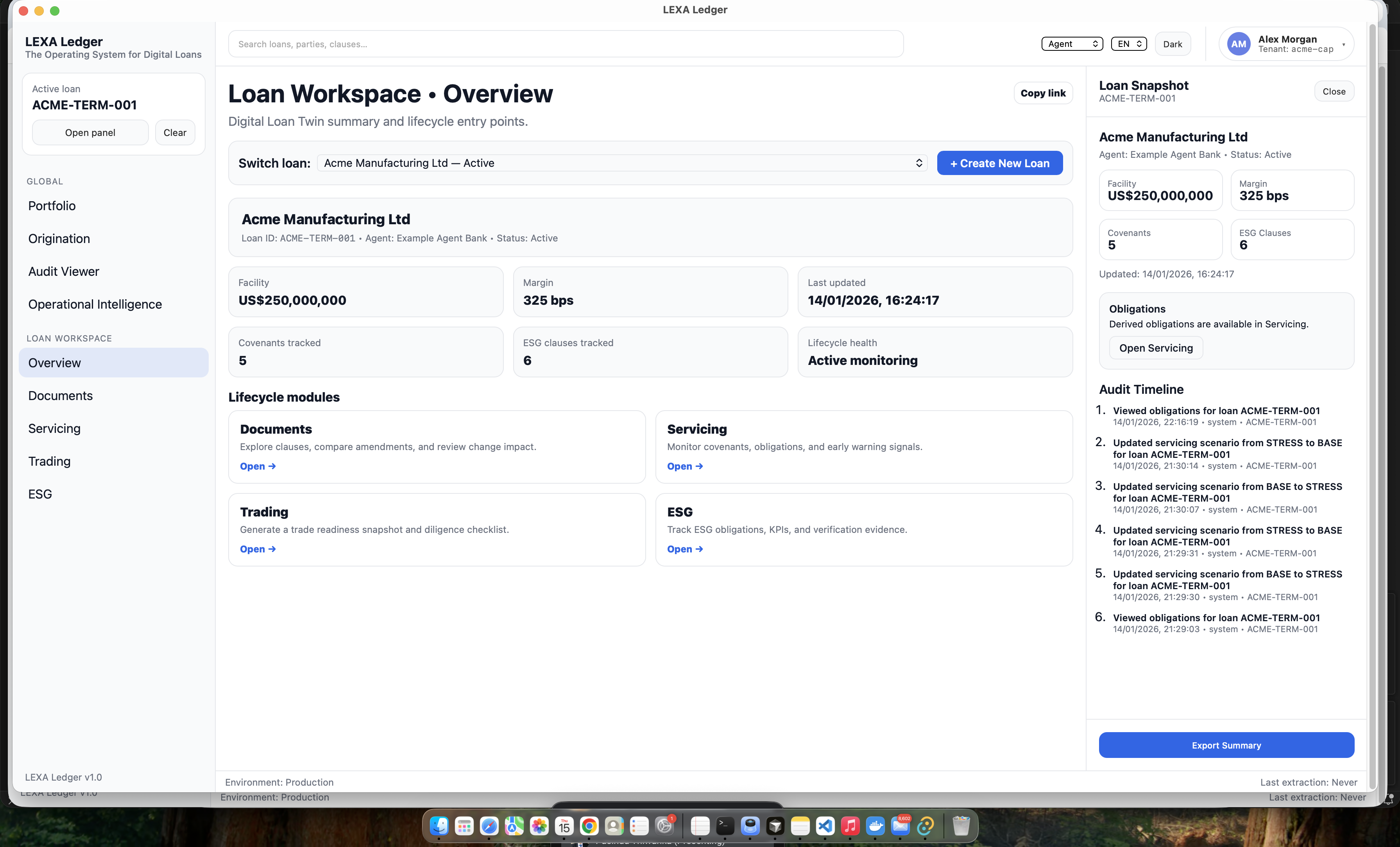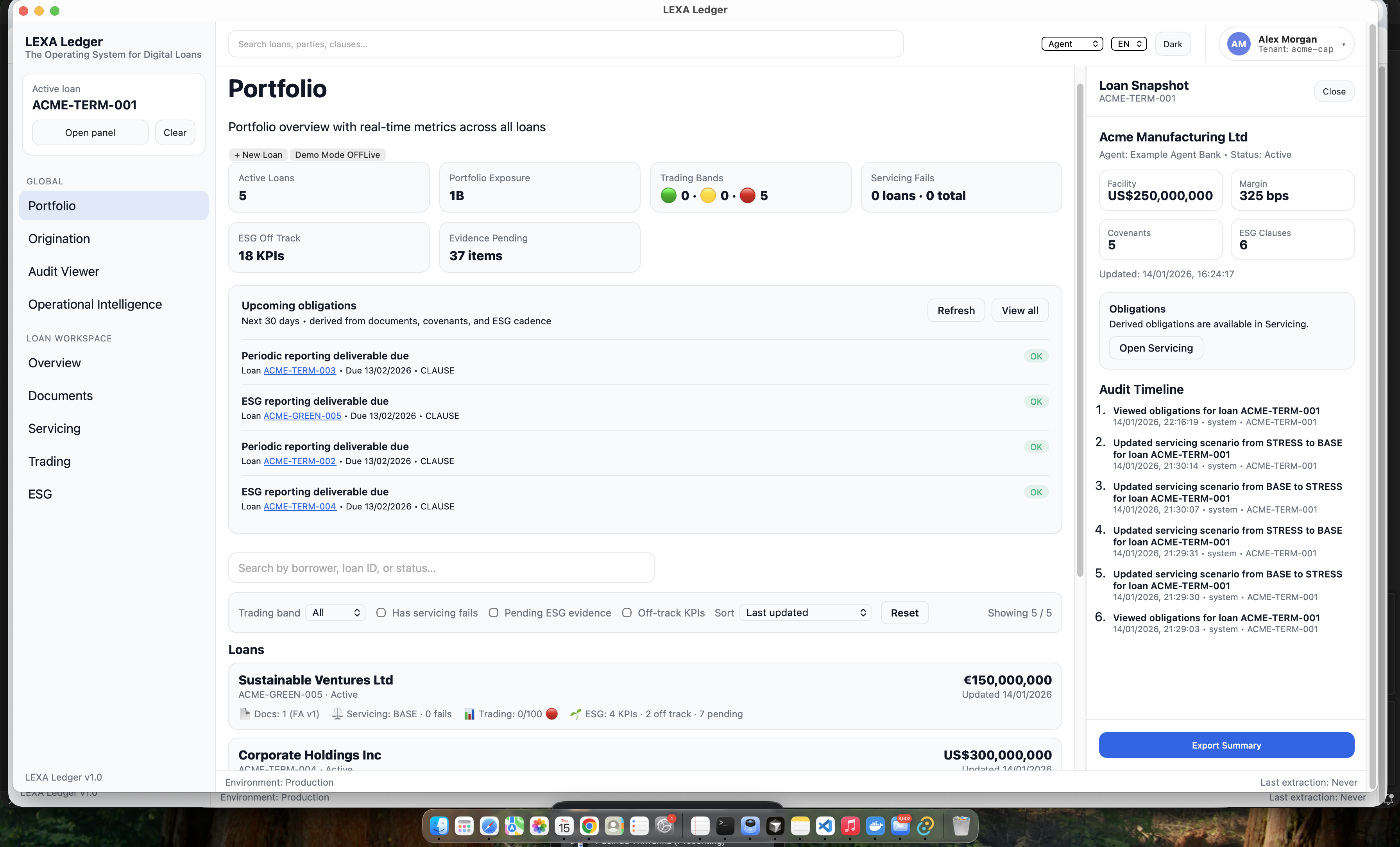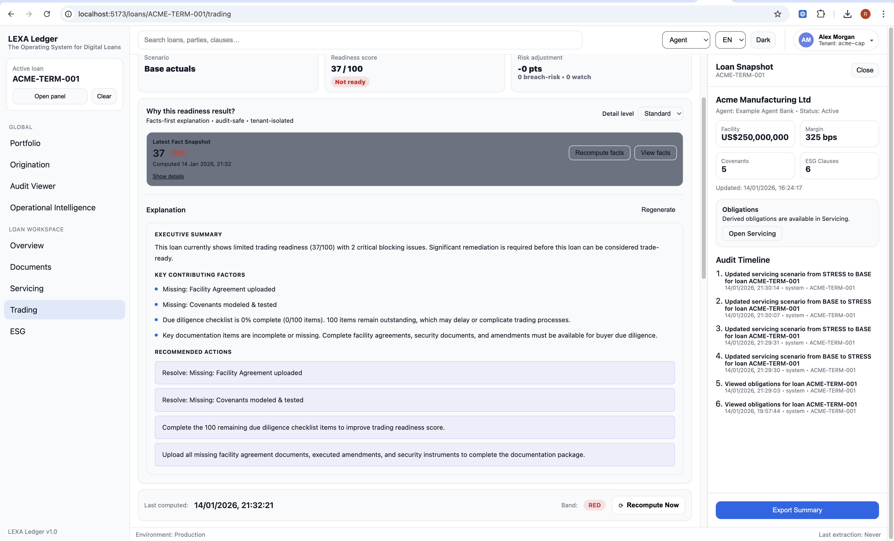 Obligations are derived automatically from documents, covenants, and ESG cadence Trading readiness explanations are facts-first and audit-safe Portfolio views show real operational signals One-click export produces compliance-ready summaries with audit history