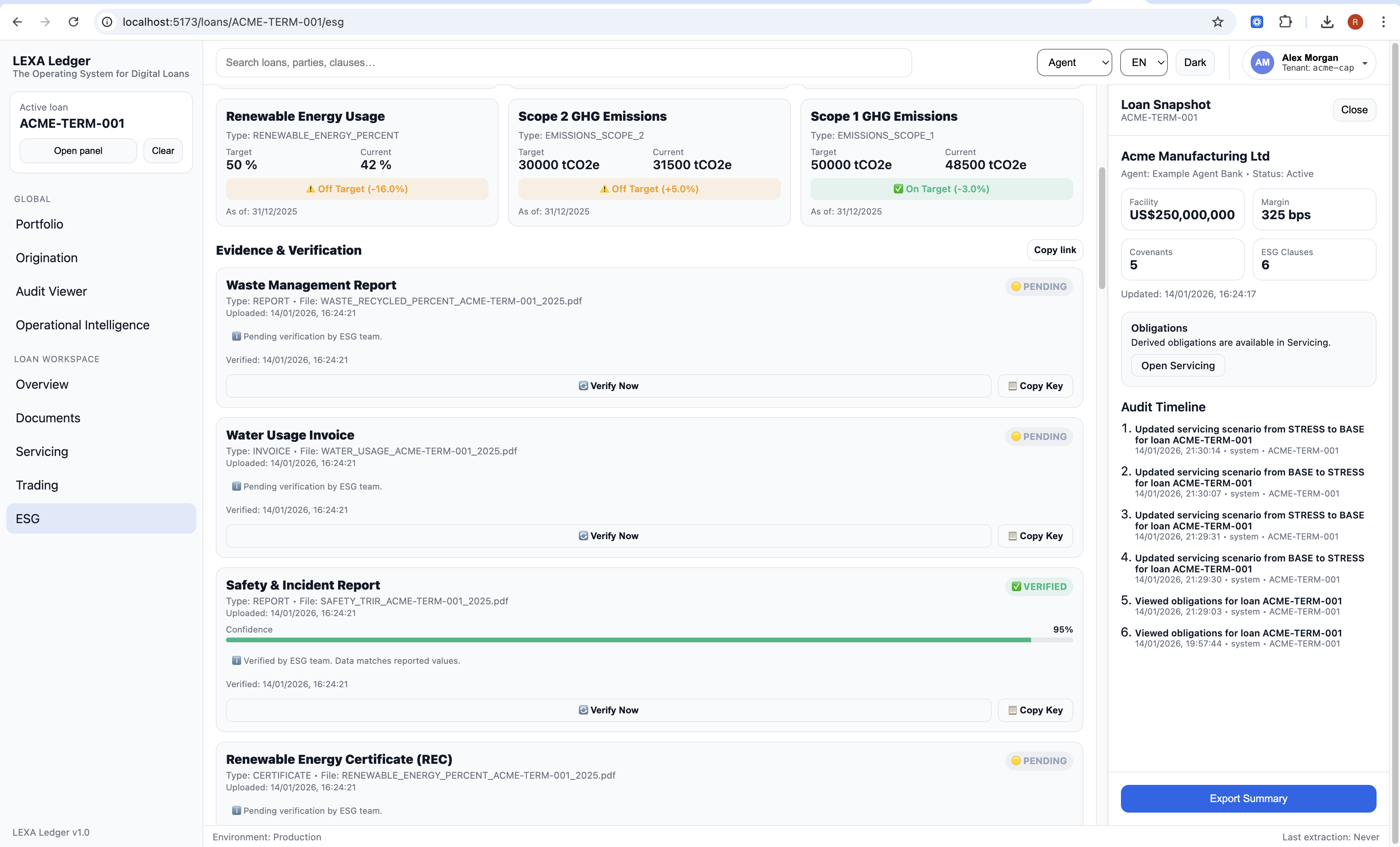 Documents: loan agreements and amendments structured into machine-readable facts Servicing: covenant monitoring, obligations, and risk visibility Trading: explainable readiness scoring grounded in verified facts ESG: KPI tracking, evidence, and verification Portfolio Intelligence: rollups, obligations, and risk across loans Audit and Compliance: full traceability of every action and AI explanation