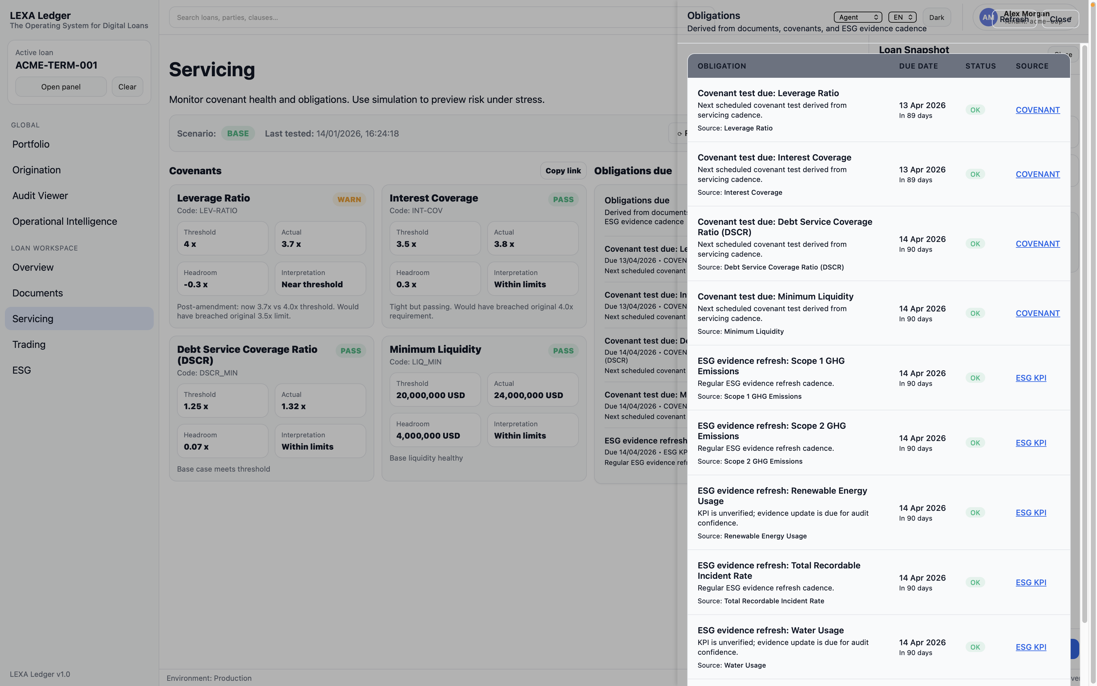 Servicing view monitoring covenant health, stress scenarios, and automatically derived obligations from documents and ESG cadence.