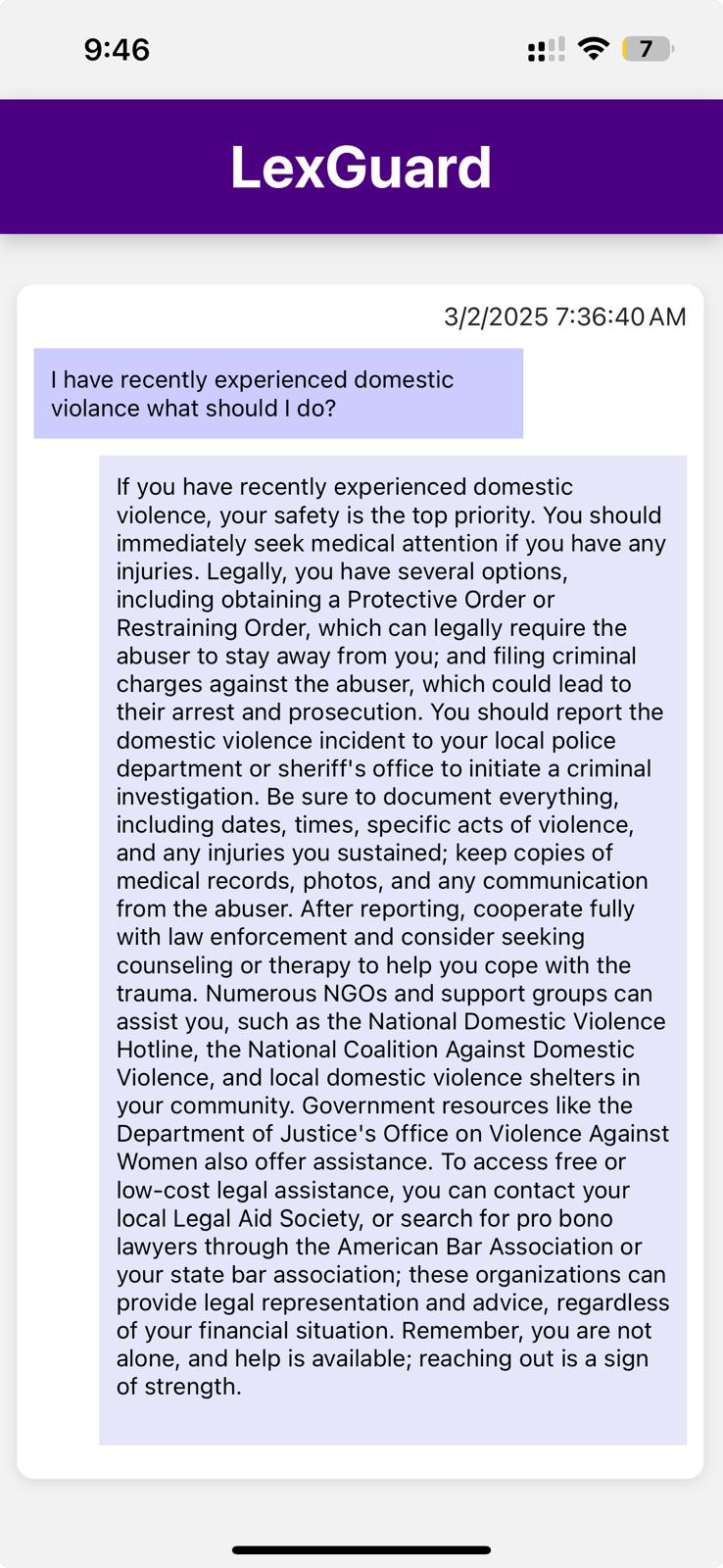 Powered by Gemini AI, LexGuard provides personalized legal resources, step-by-step guidance on legal procedures, and emergency support to those in vulnerable situations. With a user-specific profile, it enables users to alert emergency contacts instantly in crisis situations, ensuring rapid response and safety.
