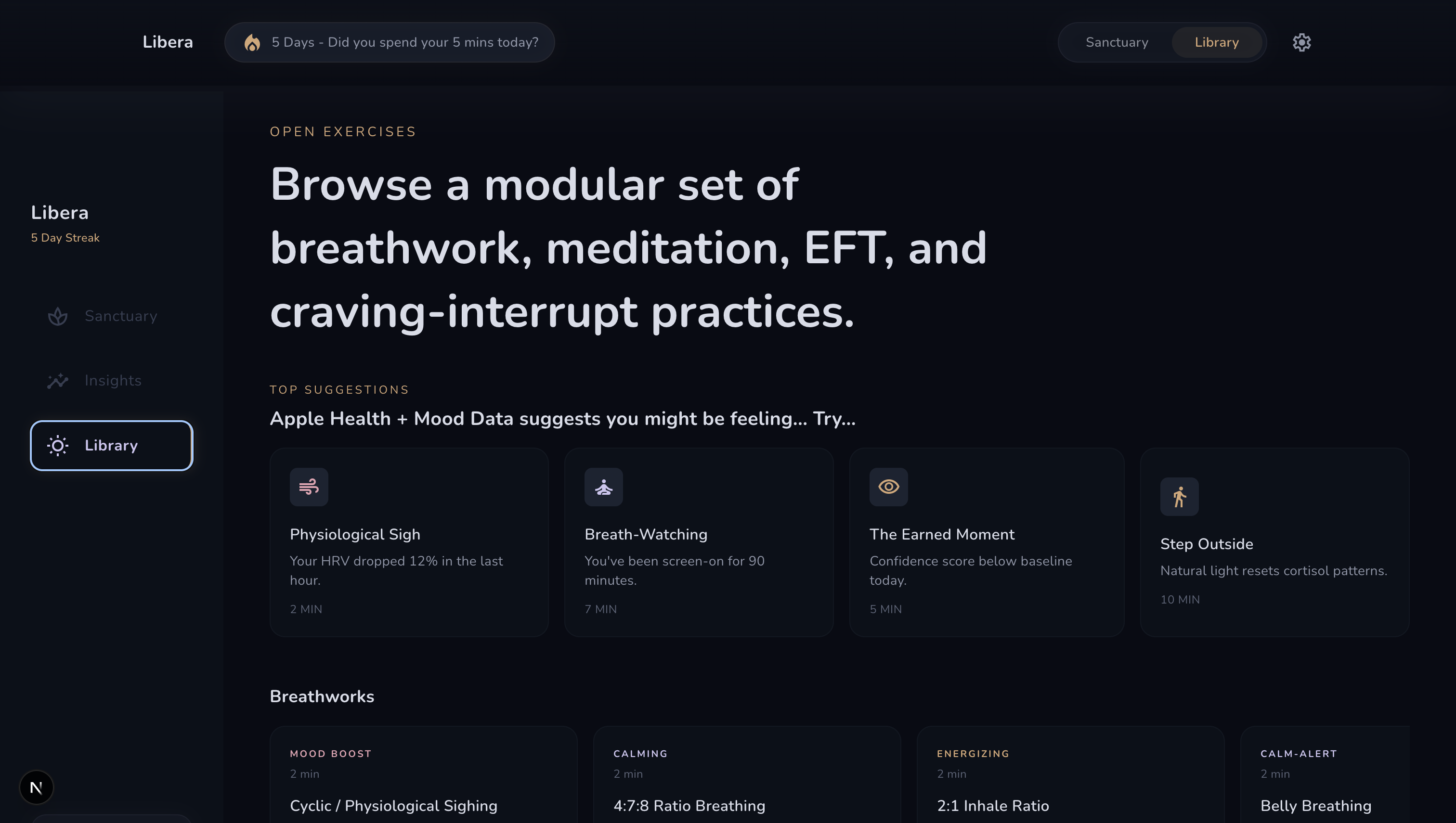 The frustration that started this was quite simple: all the tools that work for mental health — breathwork, EFT, meditation, journaling — exist in total isolation from each other. You find a breathwork app, a meditation app, a journaling app, and you cobble something together and still feel like something is missing. What was missing, I think, was a sense of direction. A sense that the practice was pointing somewhere. The word we kept coming back to was agency — not calm, not wellness, but the felt sense that you are steering. That gap, between having access to techniques and actually feeling free, was where this started.