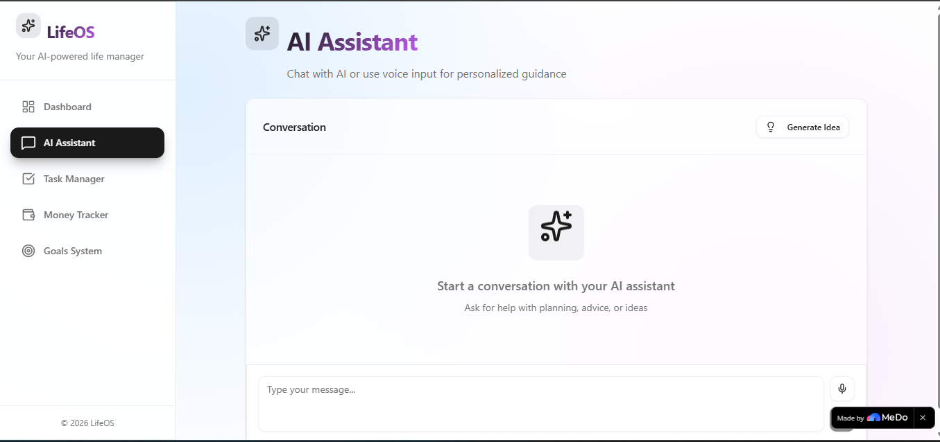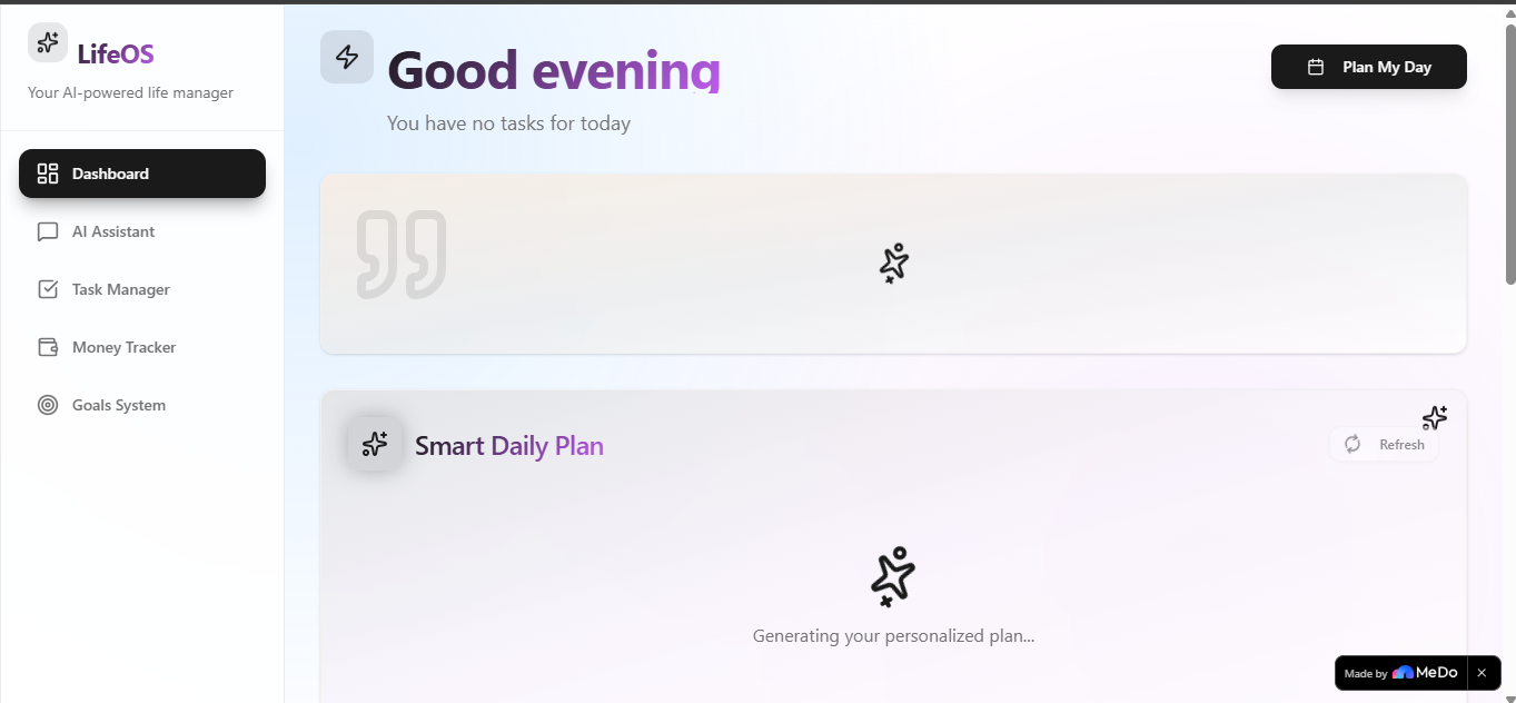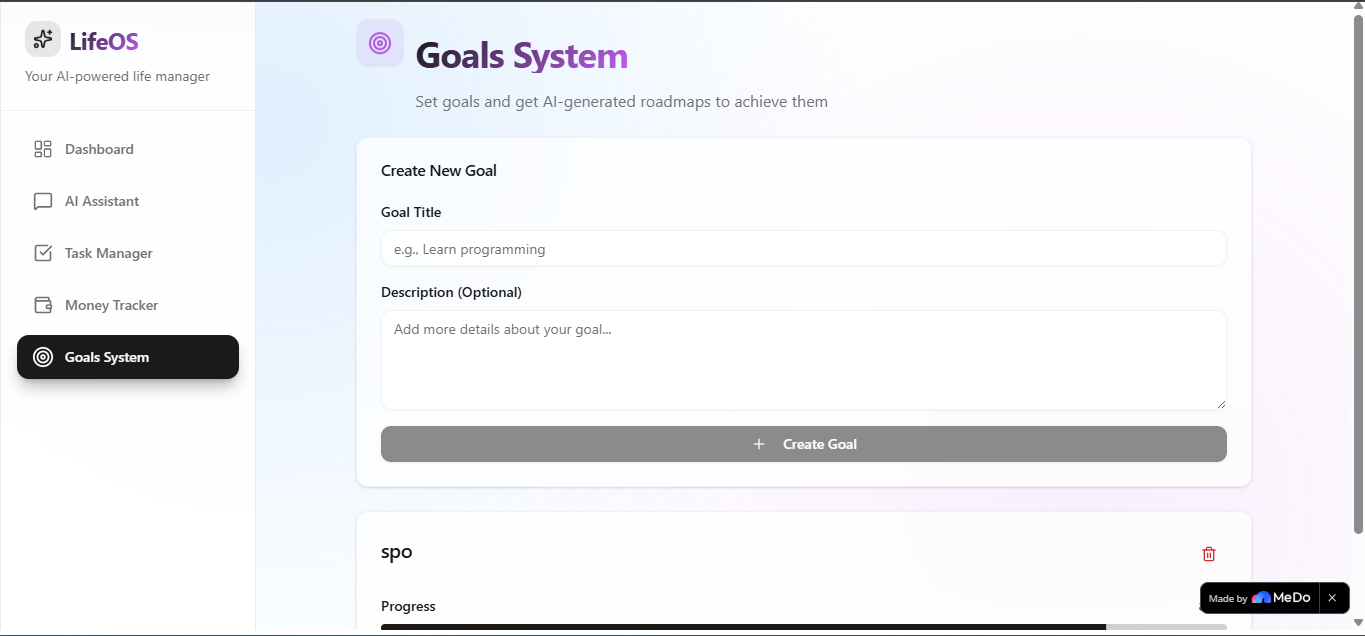 We built LifeOS AI using Medo.dev as a no-code AI-powered development platform. The system is designed with a modern dashboard UI that organizes goals and tasks into an easy-to-use interface.