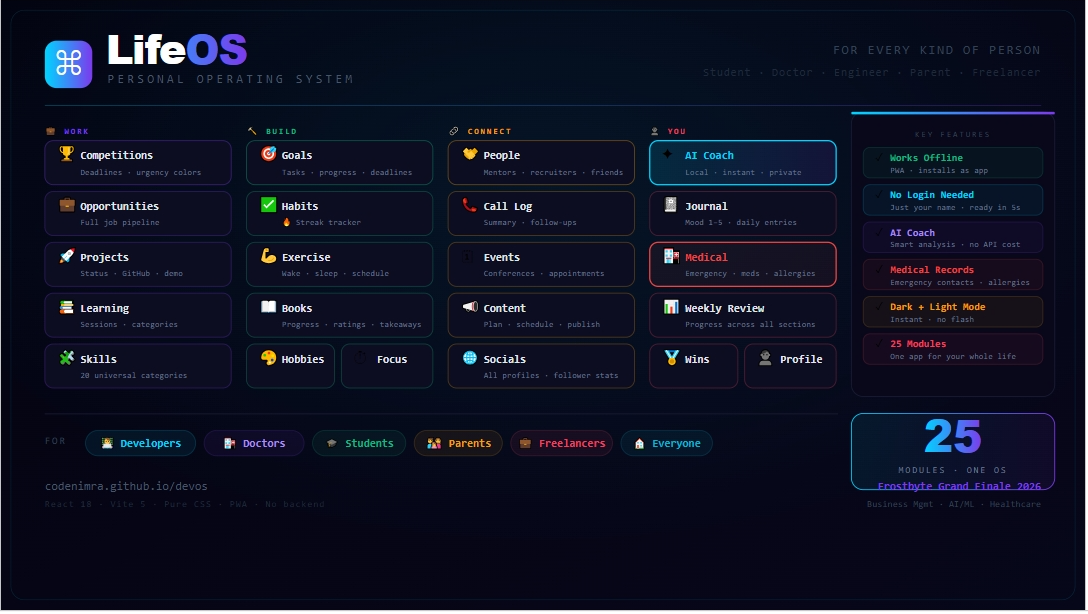 LifeOS is a complete, working product not a prototype. Every module functions. Every section opens with real data already present so any visitor understands the value without filling in a single form.