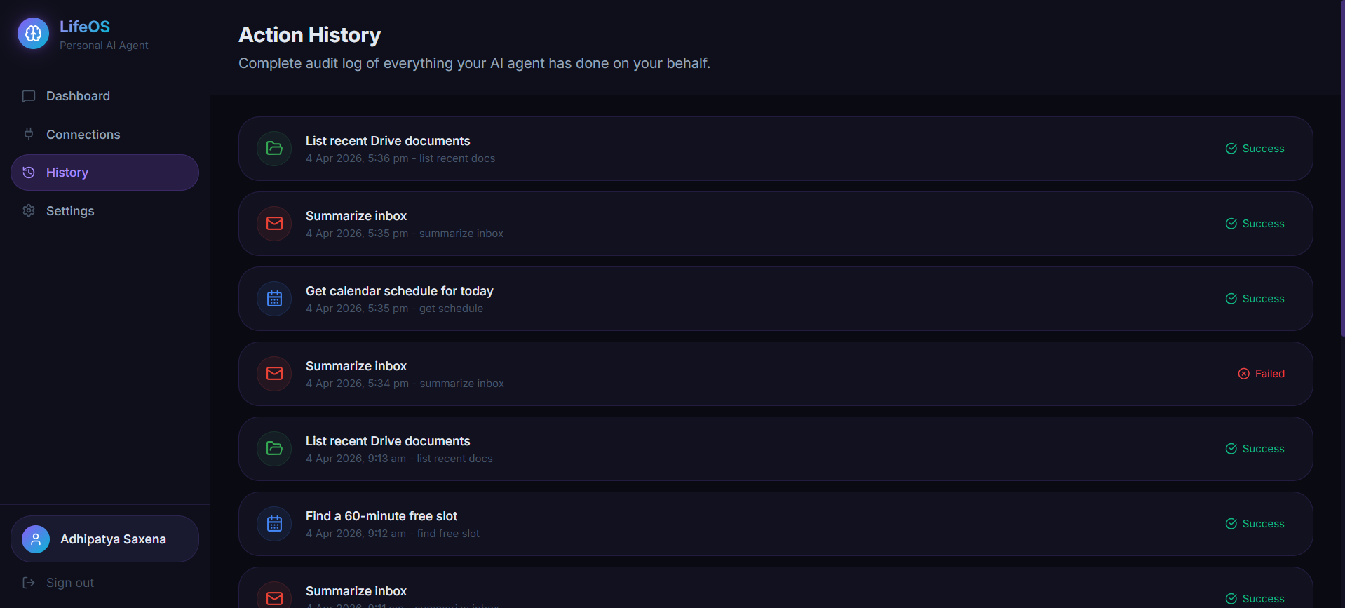 LifeOS is a personal AI agent you interact with through a chat interface in your browser. You type a message in plain English — "what did I miss in my inbox today?", "block an hour for deep work tomorrow at 10 AM", "create a meeting notes doc for my 3 PM call" — and the agent connects to your real Gmail, Google Calendar, and Google Drive accounts to do exactly that.