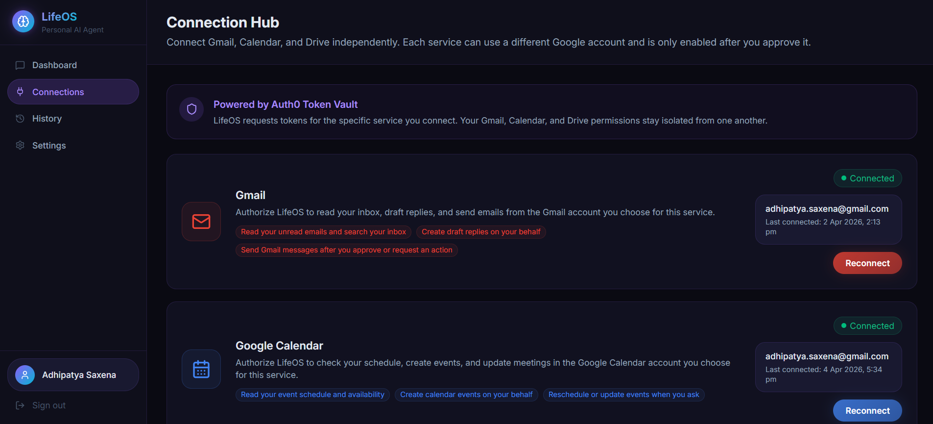 Google service connections: We bypassed Auth0's paid Token Vault feature and implemented a direct Google OAuth 2.0 flow. When a user connects Gmail, Calendar, or Drive, the app builds a Google authorization URL, redirects through the consent screen, and exchanges the authorization code for access and refresh tokens, which are saved directly into the user's Convex table. Automatic token refresh happens server-side whenever a token is close to expiry.