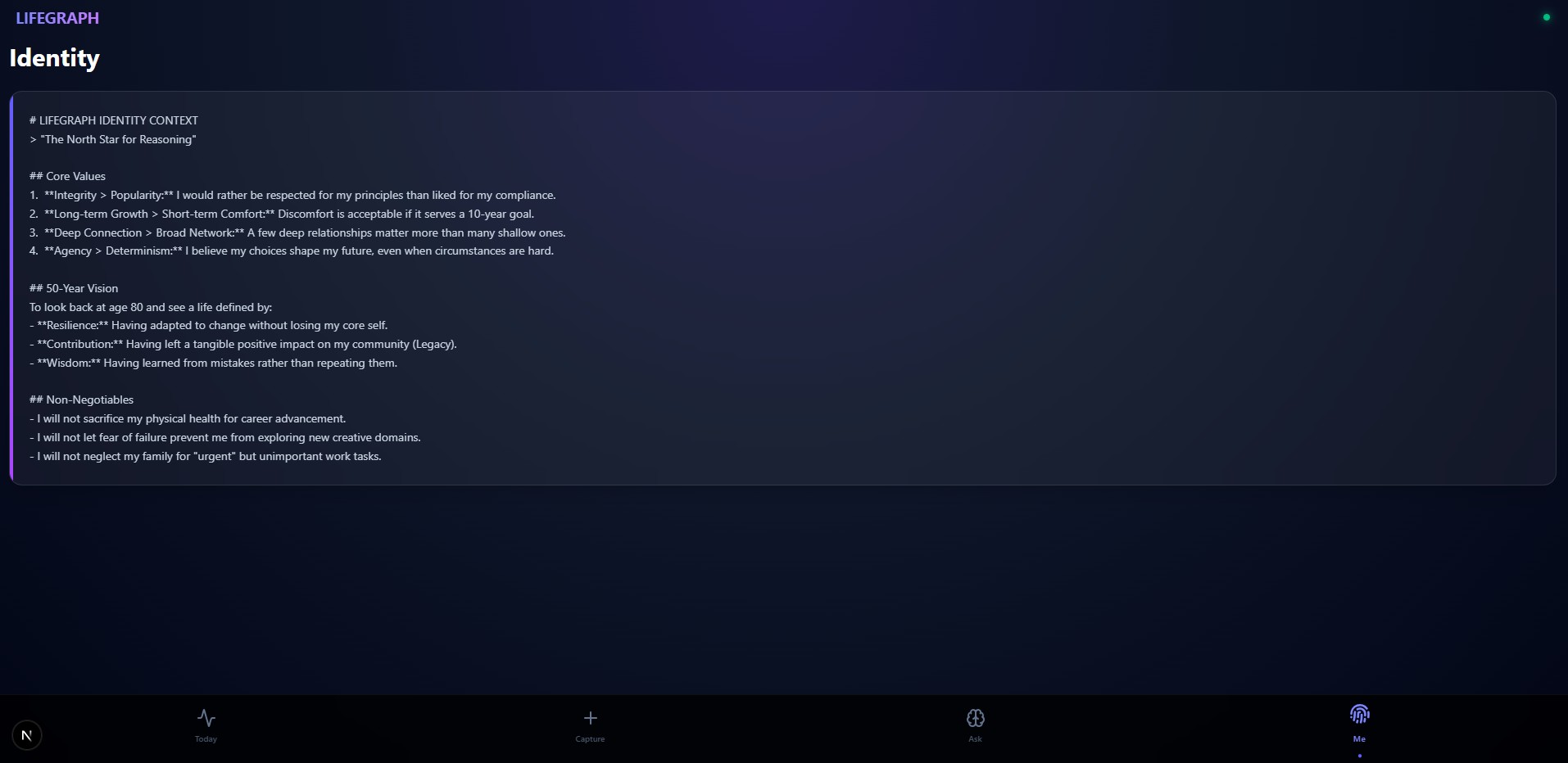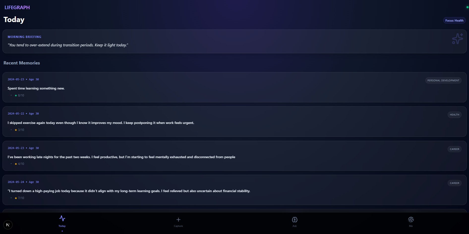 The primary challenge was resisting short-term optimization. Most AI tools push toward automation or task execution. LIFEGRAPH required careful design to keep AI advisory, reflective, and human-controlled. Designing for decades — not moments — required restraint and ethical clarity.