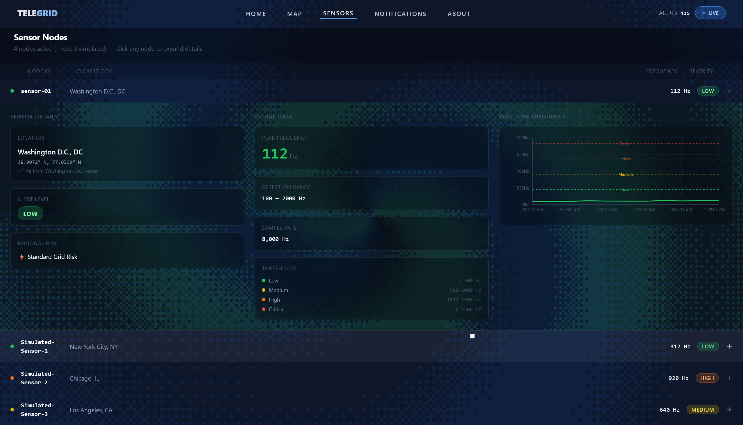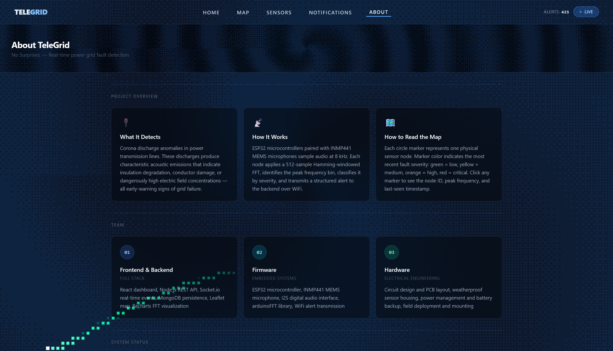 TeleGrid is a real-time, affordable monitoring system that detects corona discharge * , an early indicator of power line faults. It continuously listens for the unique sound signature of electrical discharge and sends this data to a web dashboard, allowing users to remotely monitor grid health and receive early alerts.