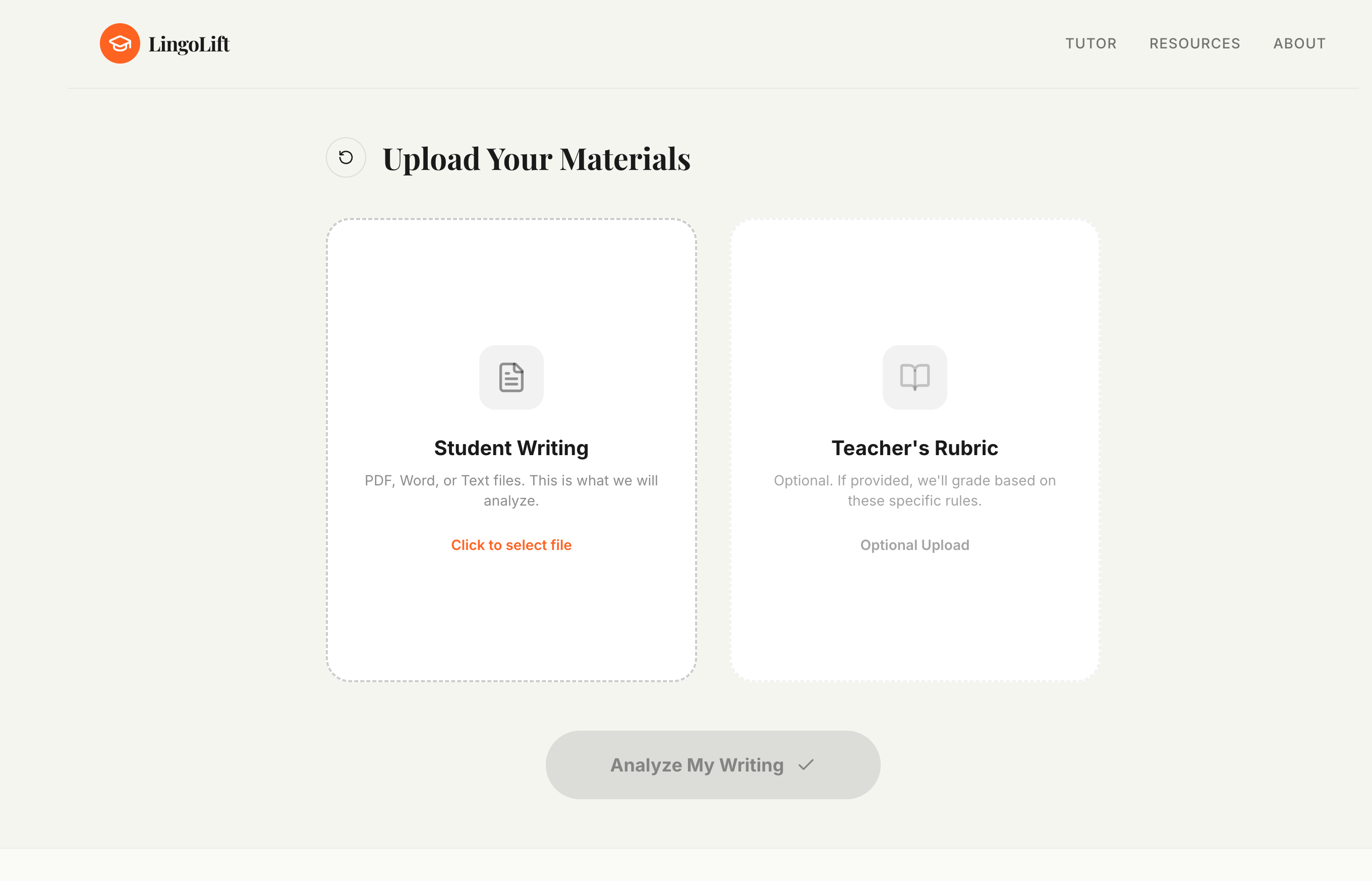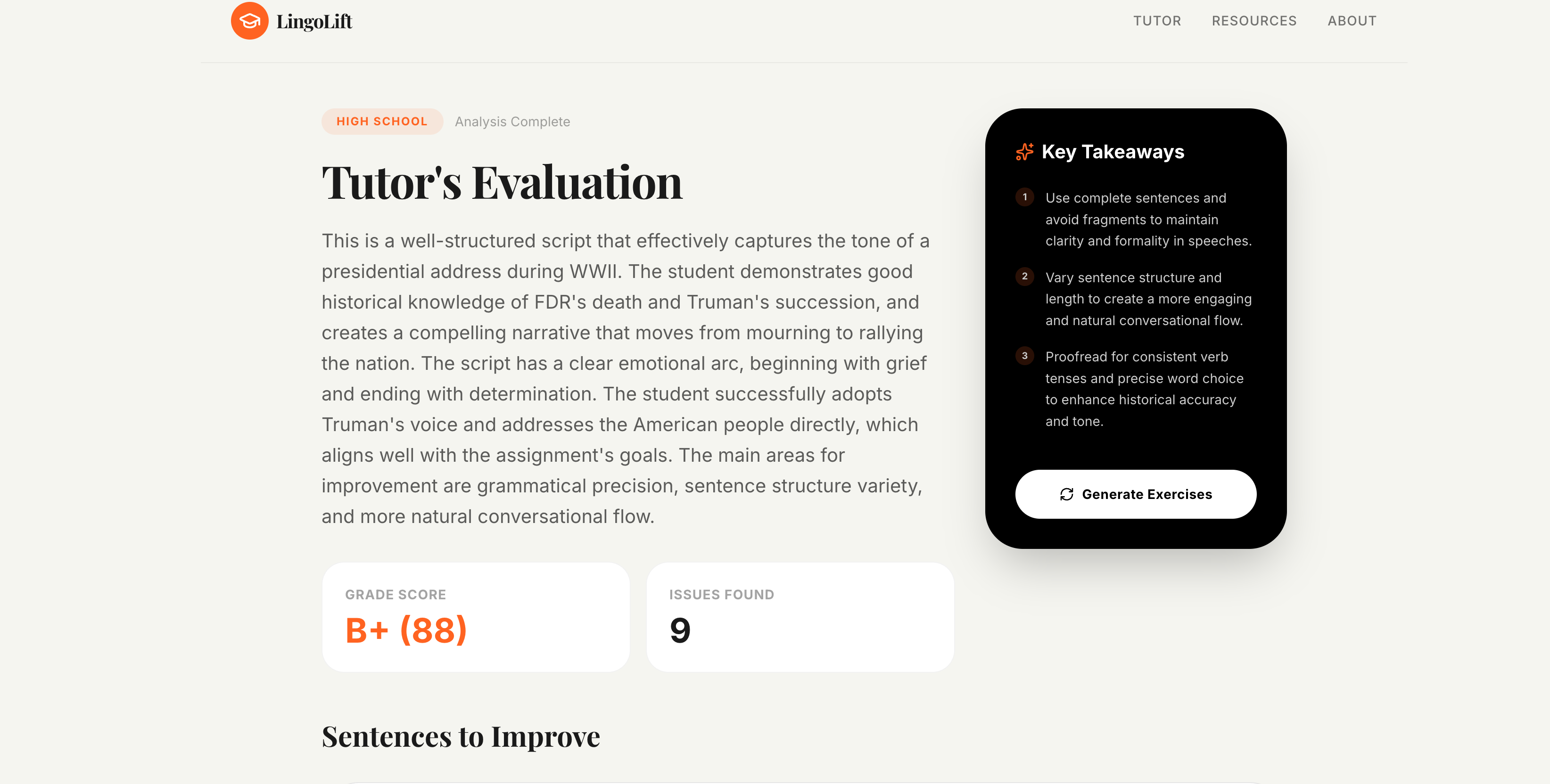 We built the app with a modern web stack and integrated AI to analyze writing and generate helpful revisions and feedback. The product was designed to feel simple and supportive so learners can focus on improving their writing instead of getting overwhelmed.