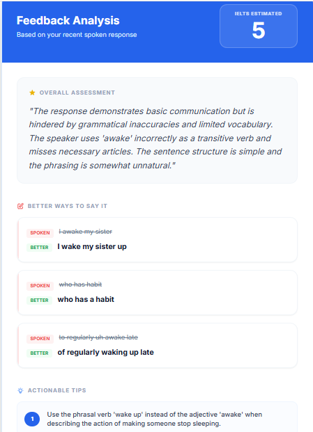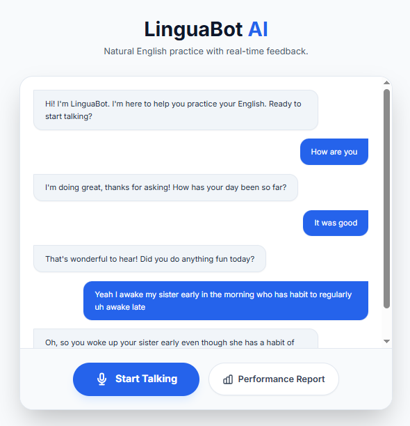 LinguaBot lets users speak naturally through their microphone and have a real-time spoken conversation with an AI. After the conversation, the user can generate a performance report that estimates an IELTS-style band score and provides detailed feedback, grammar corrections, and improvement tips.