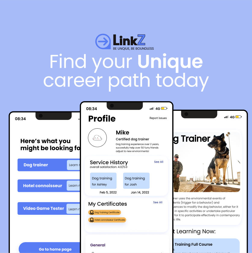 Besides popular career paths like technology and finance, what other kinds of career opportunities have we missed? After the pandemic, how could we help unemployed people explore other potential career paths? Learning from major job-searching and networking platforms like LinkedIn and Fiverr, we create LinkZ to provide introductions and online courses to help people restart their life in unique career paths like art therapists or waterslide testers.