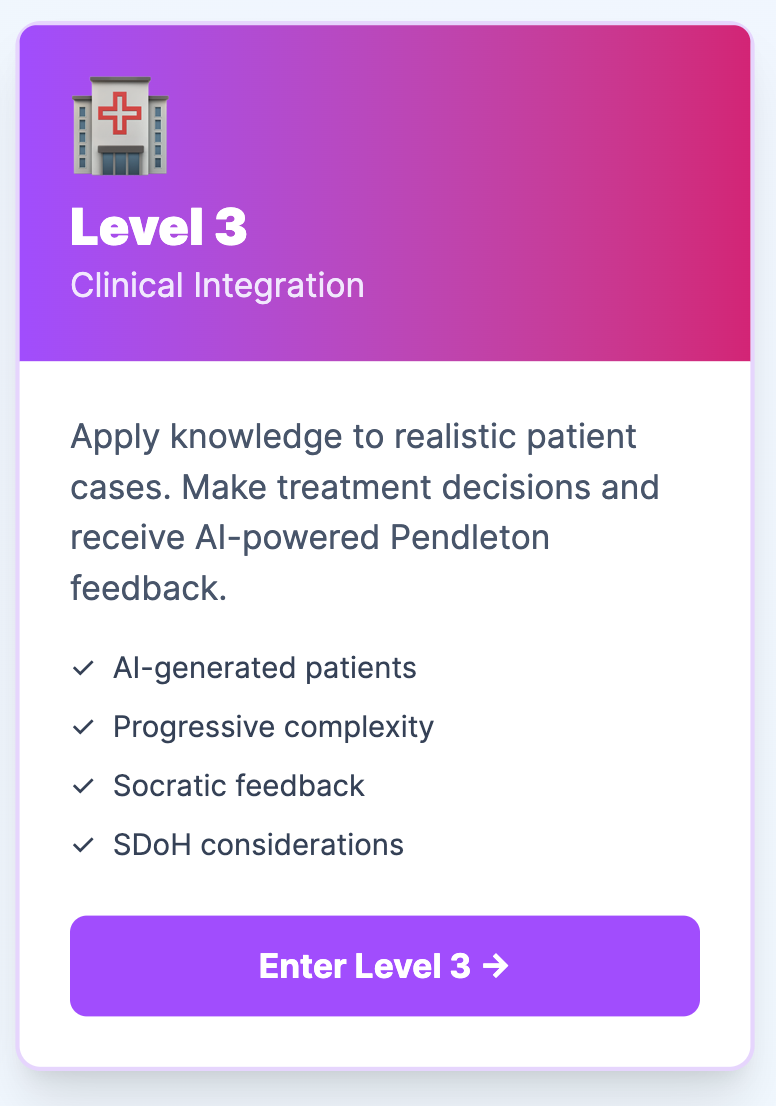 Level 3 – Clinical Integration: Full case simulations combine lab results, patient factors, and drug effects for patient-centered prescribing.