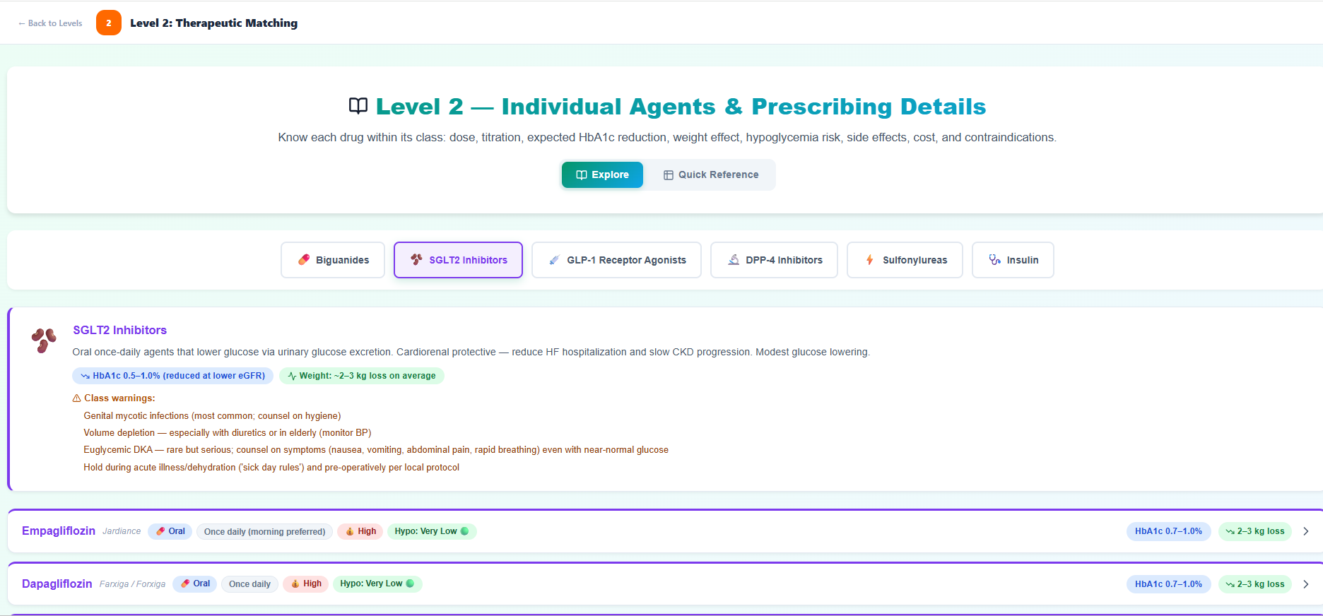 Level 2 – Therapeutic Matching: Dive deeper into drug families, their mechanisms, dosing, side effects, and comorbidity considerations through interactive learning tools and reference tables.