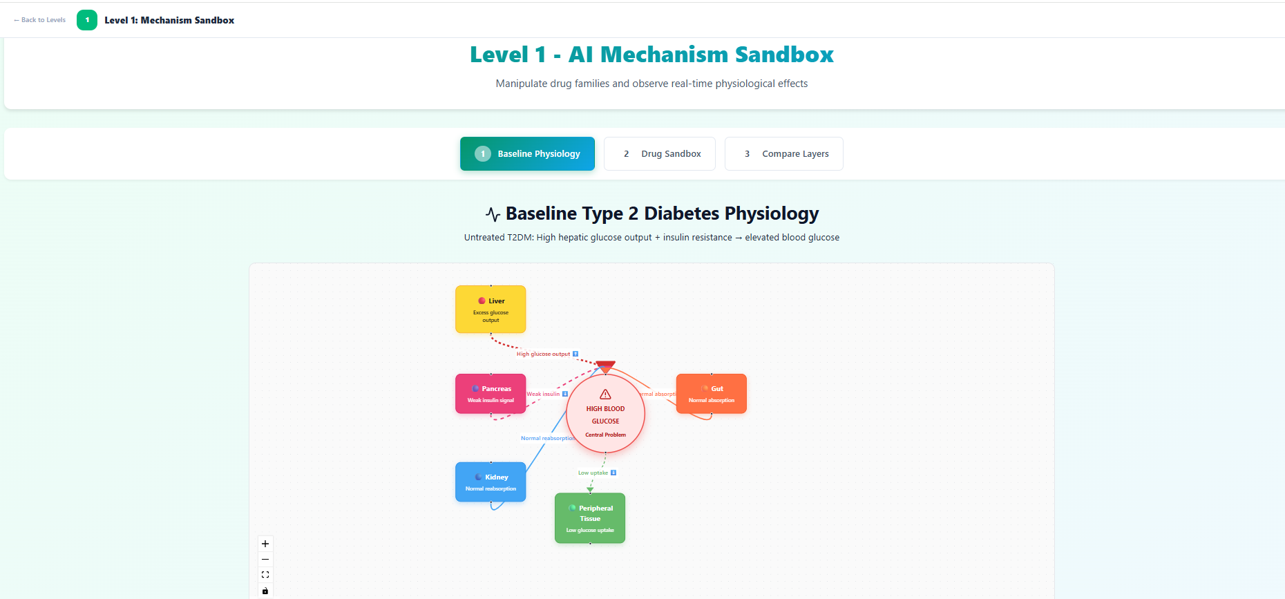 Level 1 – Mechanism Sandbox: Explore baseline T2D physiology and toggle drug families to see real-time changes in glucose, hormones, and organ-level effects.