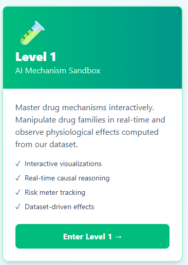 - AI-powered dynamic effects: Drug mechanisms and side effects are pulled from a structured dataset, producing accurate animations and causal explanations.