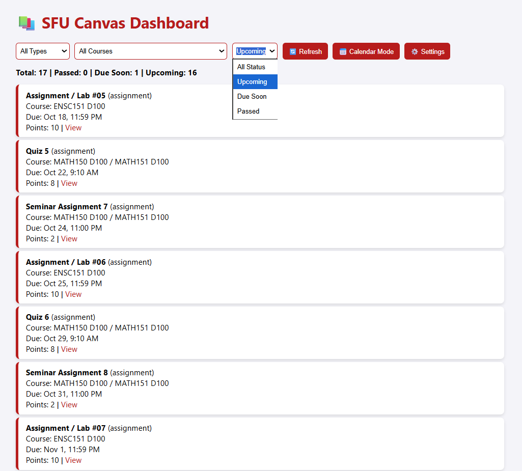 - Organizes — Sorts by due date, course (e.g., ENSC151, MATH151), type (assignment, quiz, exam), and status (past, due soon, upcoming).