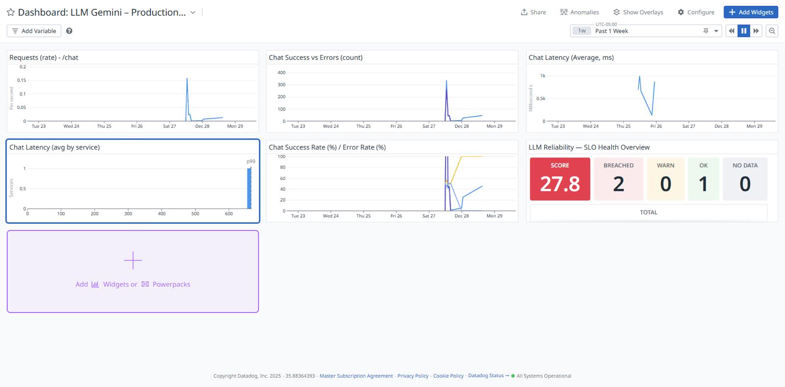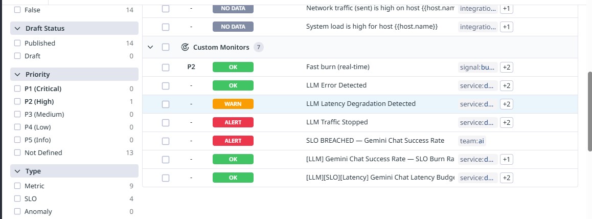 The main challenge was modeling LLM reliability correctly, especially ensuring metrics were emitted in a way compatible with Datadog SLOs and avoiding common pitfalls with averages vs counts. Designing Meaningful Observability for LLMs A key challenge was deciding what signals actually represent LLM health, beyond simple uptime. How I addressed it: Focused on success rate, latency, and error budgets Modeled reliability using SLOs instead of raw metrics Used burn-rate–based detection instead of static thresholds