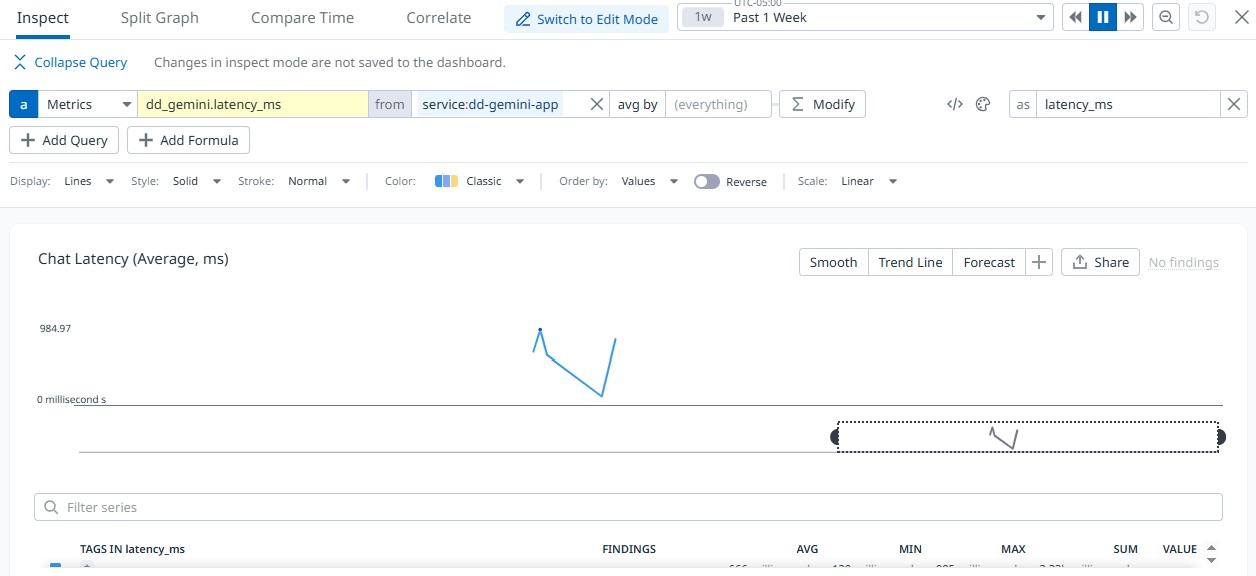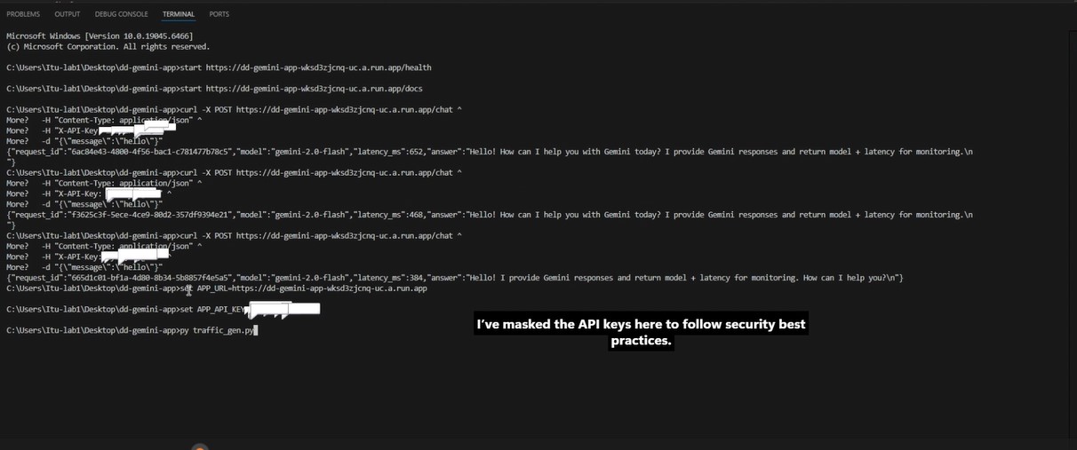 This project deploys a Gemini-powered chat API on Google Cloud Run and instruments it with Datadog to track: