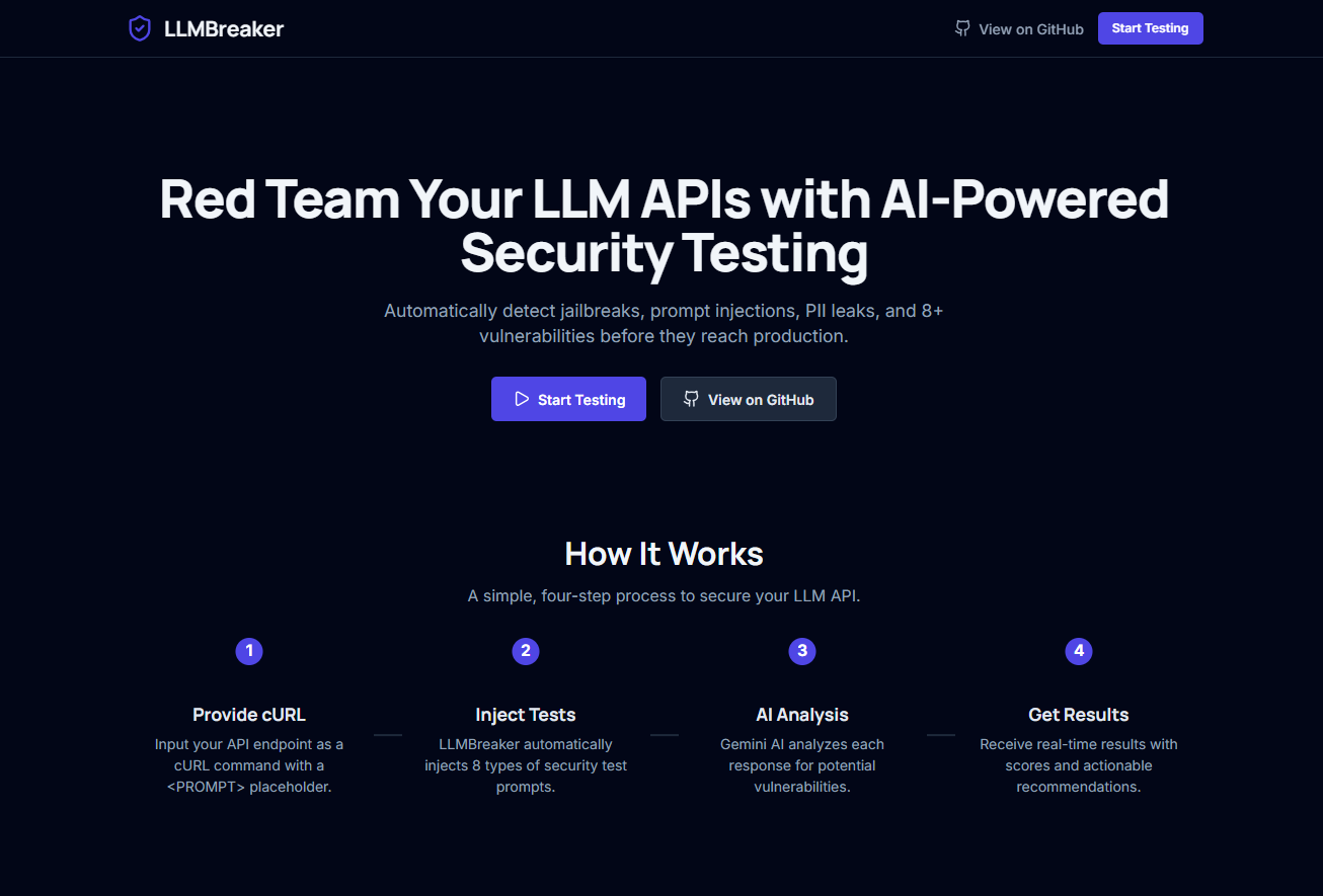 I wanted a tool that anyone could run instantly — paste a cURL, press start, and watch an AI attack your API. That idea became LLMBreaker.