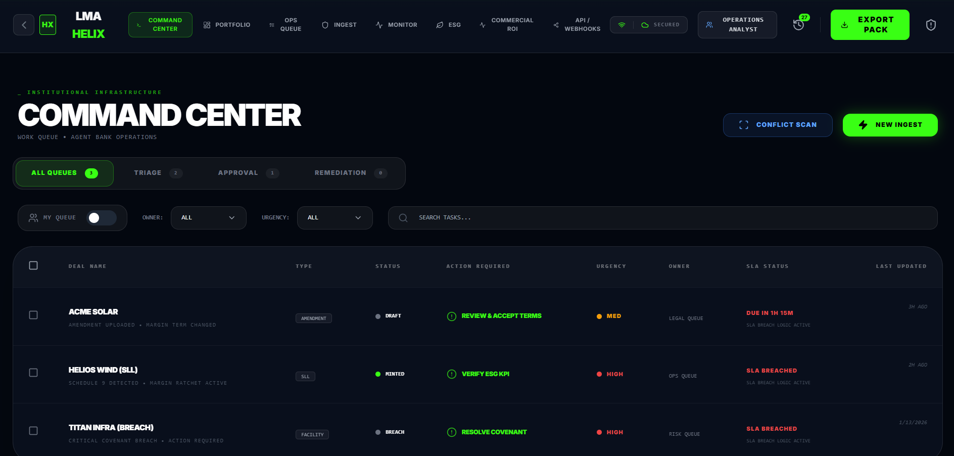 The $1.2 Trillion "Analog" Gap The syndicated loan market is the engine of global finance, yet it runs on a surprisingly archaic fuel: Static PDFs. We discovered a critical gap between "Legal Truth" (the 200-page Facility Agreement) and "Operational Truth" (the data in the bank's settlement system). Currently, Operations teams spend thousands of hours "staring and comparing"—manually re-keying data from contracts into spreadsheets. This leads to: Operational Risk: Manual error creeps into interest calculations. Liquidity Drag: Secondary trading is slowed by weeks of due diligence. Greenwashing: ESG targets in Sustainability-Linked Loans (SLLs) are hard to verify and track. We built LMA Helix to replace this manual friction with a deterministic, digital infrastructure. We wanted to move the industry from "Document-Centric" to "Data-Centric."
