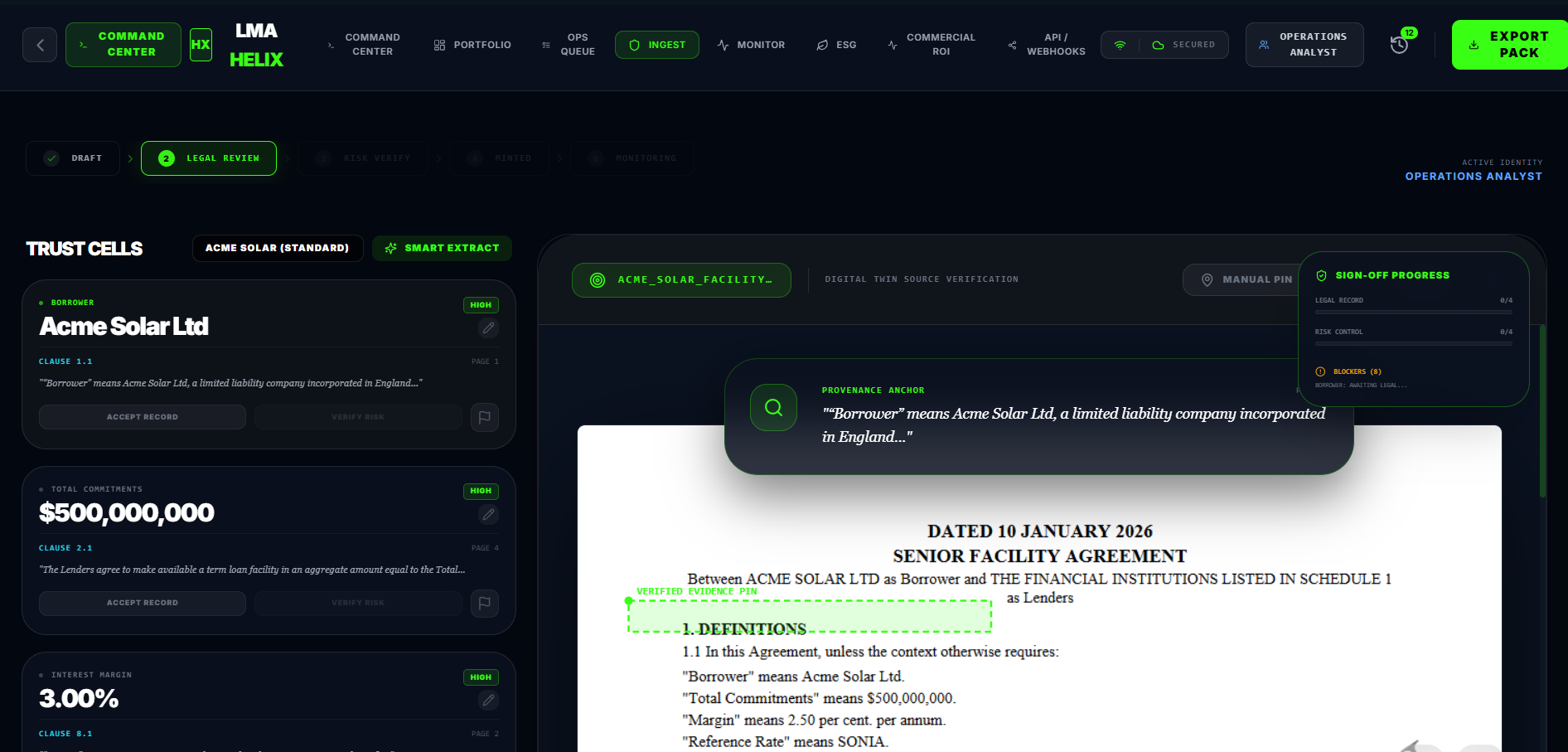 LMA Helix is the Operating System for Syndicated Loans. It transforms static LMA Facility Agreements into executable Digital Twins (Passports).