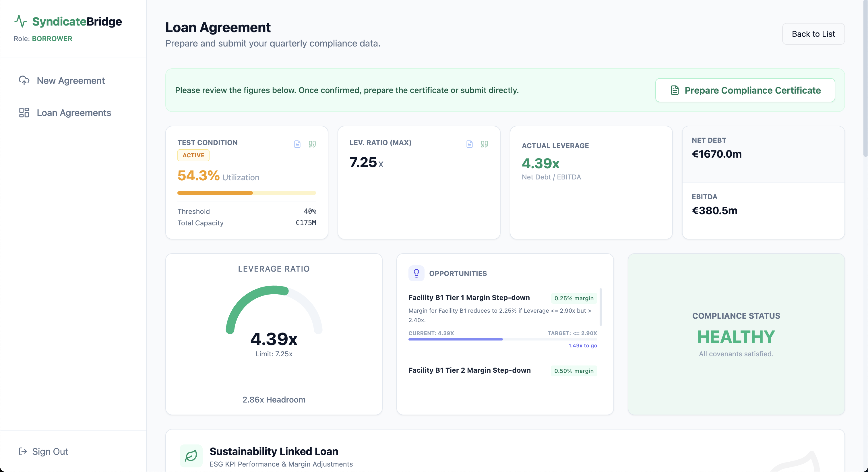 Borrower can also prepare and review their Compliance Certificate automatically so they don't have to pull the data needed one by one (which usually takes a lot of back and forth and could last for days)