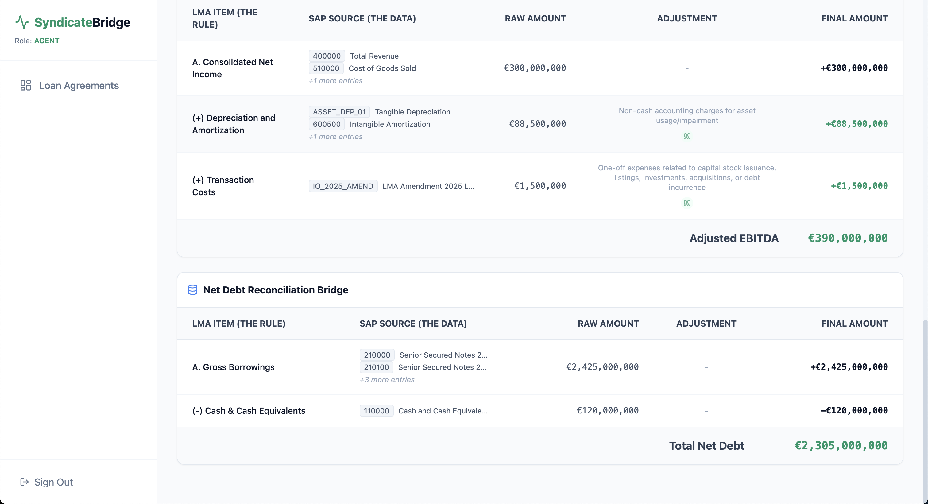 Built a reliable reconciliation workflow to map ERP data (mock) to the items mentioned in the Loan Agreement for reliable and automatic "add-backs" of EBITDA.