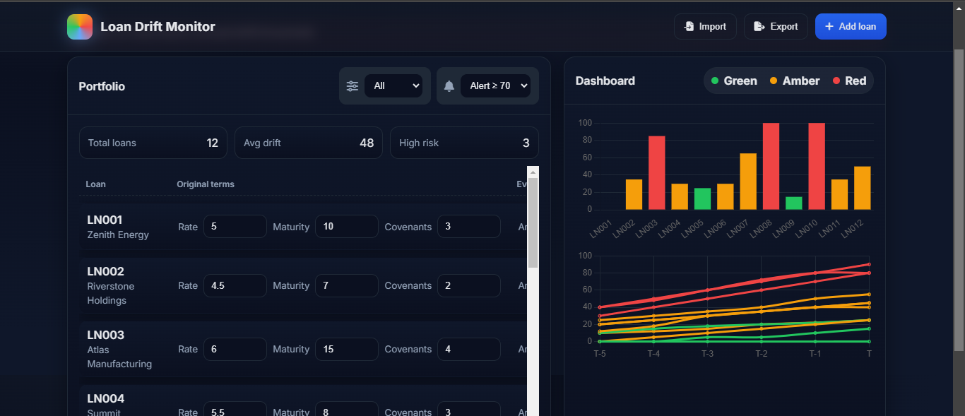 Loan Drift Monitor is a web-based dashboard that tracks loan performance, covenant compliance, and drift trends over time. It offers: