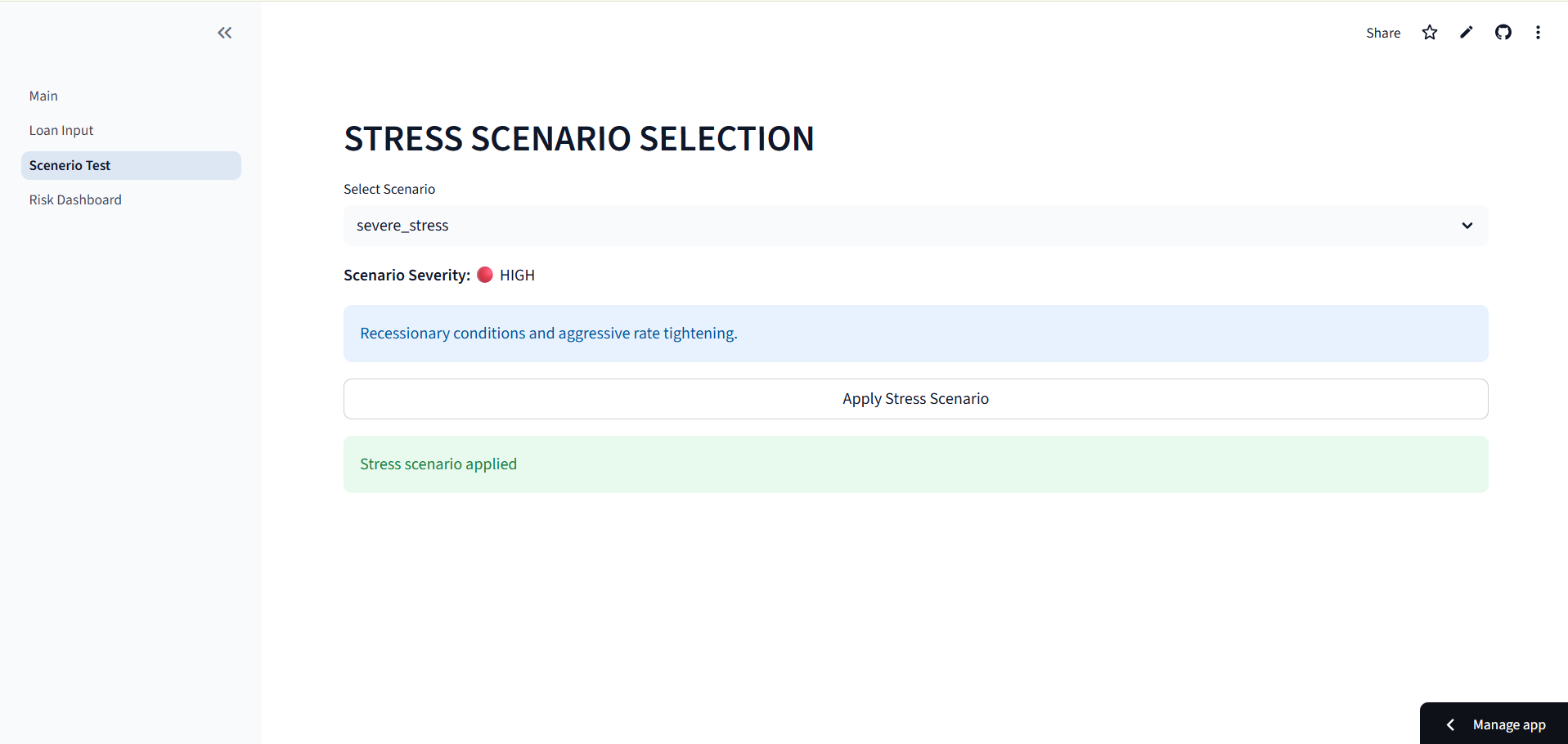 One of the main challenges was managing application state across multiple pages while ensuring that stress tests were always applied to a clearly defined baseline. This required careful handling of session state to avoid unintended recalculations.