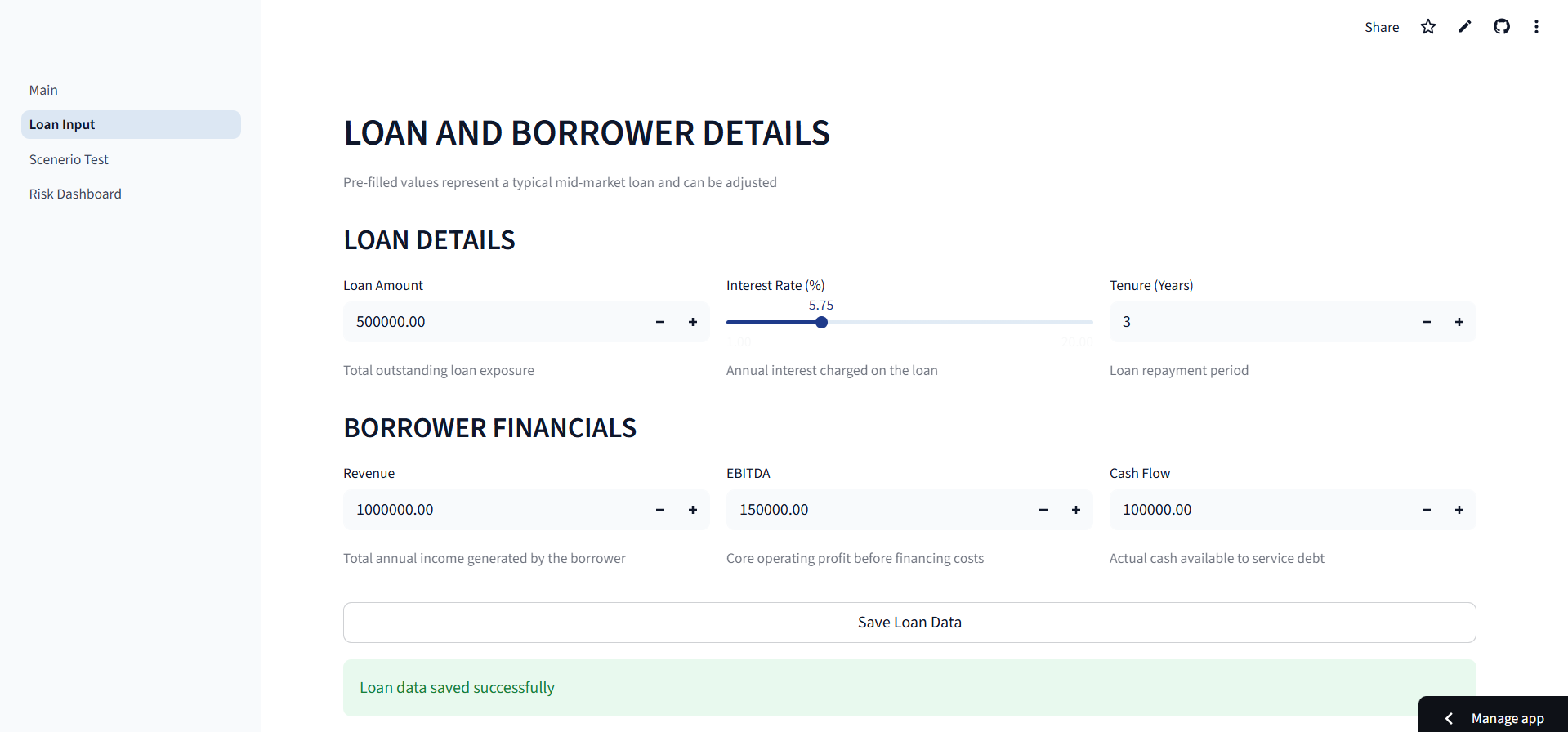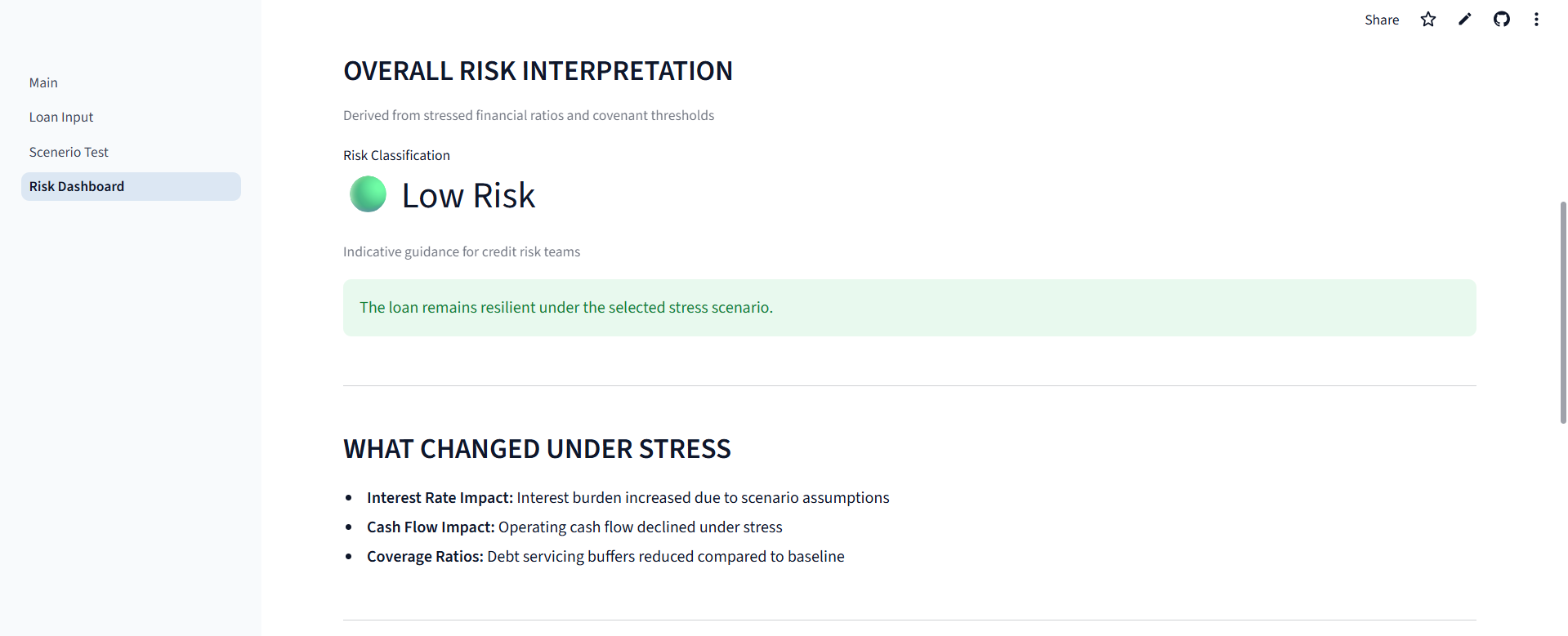This project was inspired by the idea of making loan stress testing faster, clearer, and more explainable, while staying aligned with how credit teams actually work in practice.