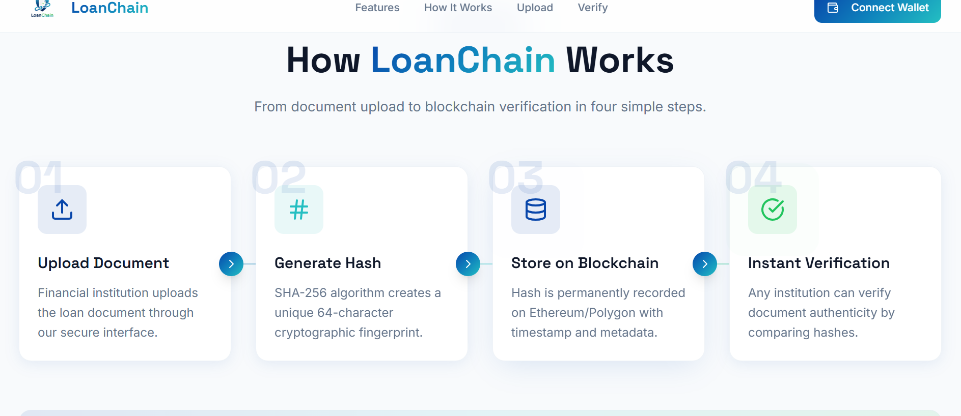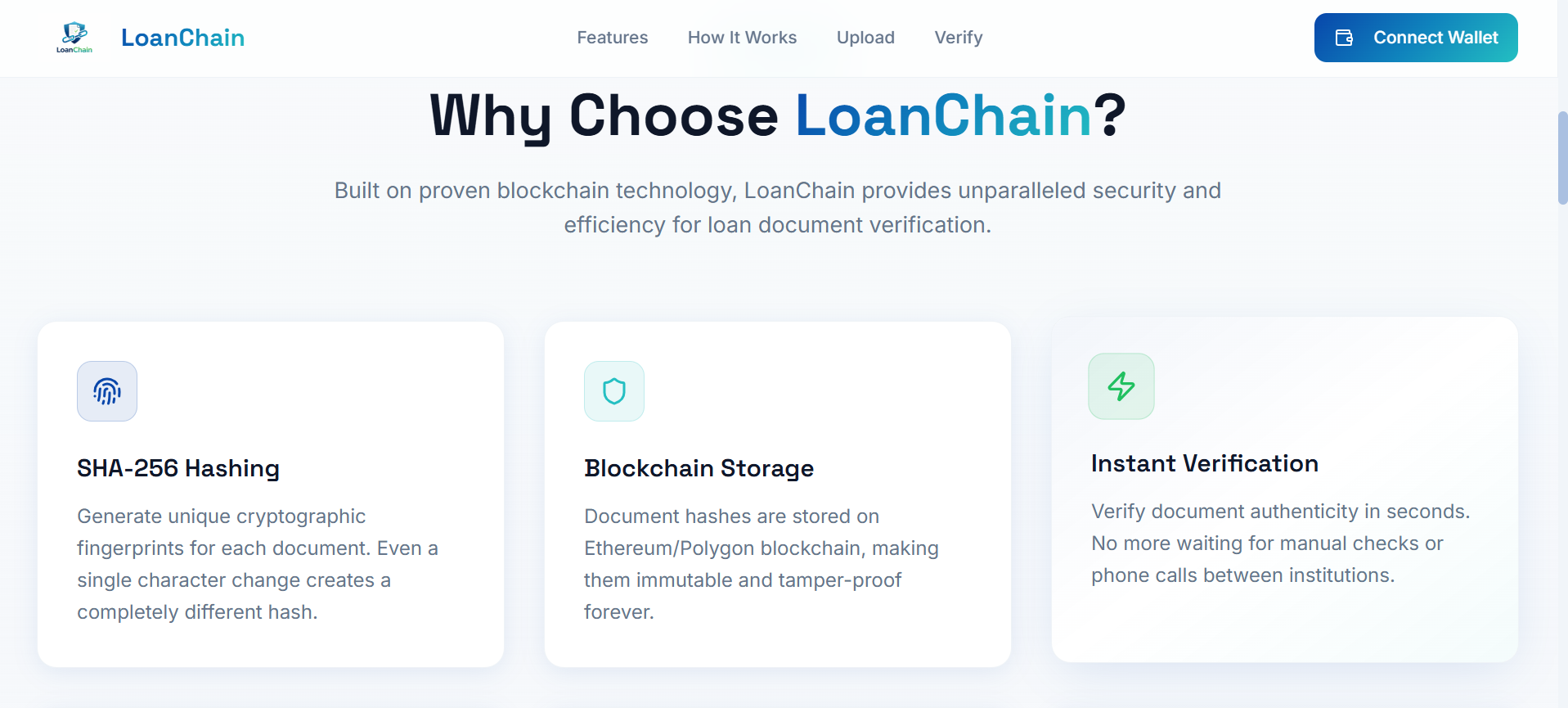 The idea behind LoanChain is to shift trust from institutions to cryptographic proof, ensuring that once a document is verified, its authenticity can be proven instantly and reliably.