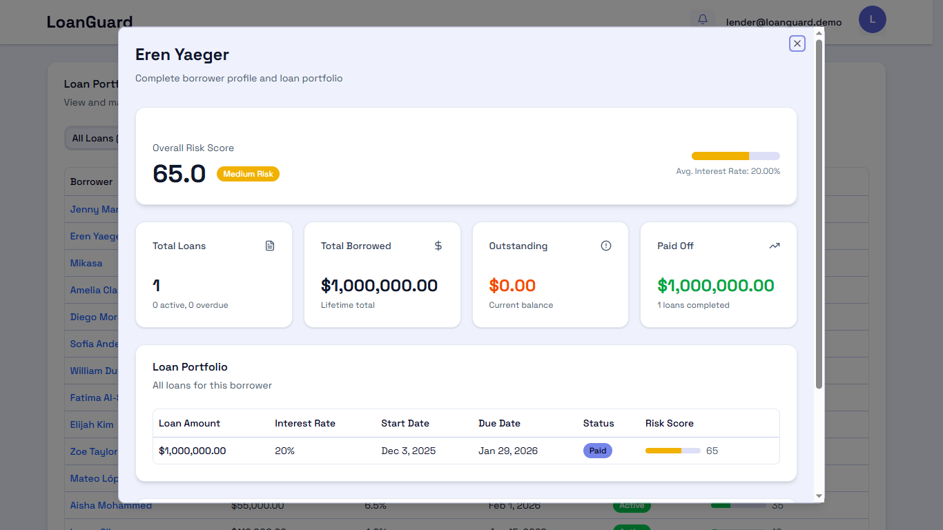 Automated Risk Assessment: Every loan gets a real-time risk score (0-100) based on a multi-factor algorithm that analyzes loan amount, interest rate, duration, and payment history. As payments are made or missed, risk scores update automatically.