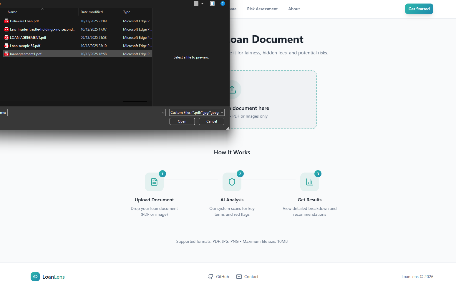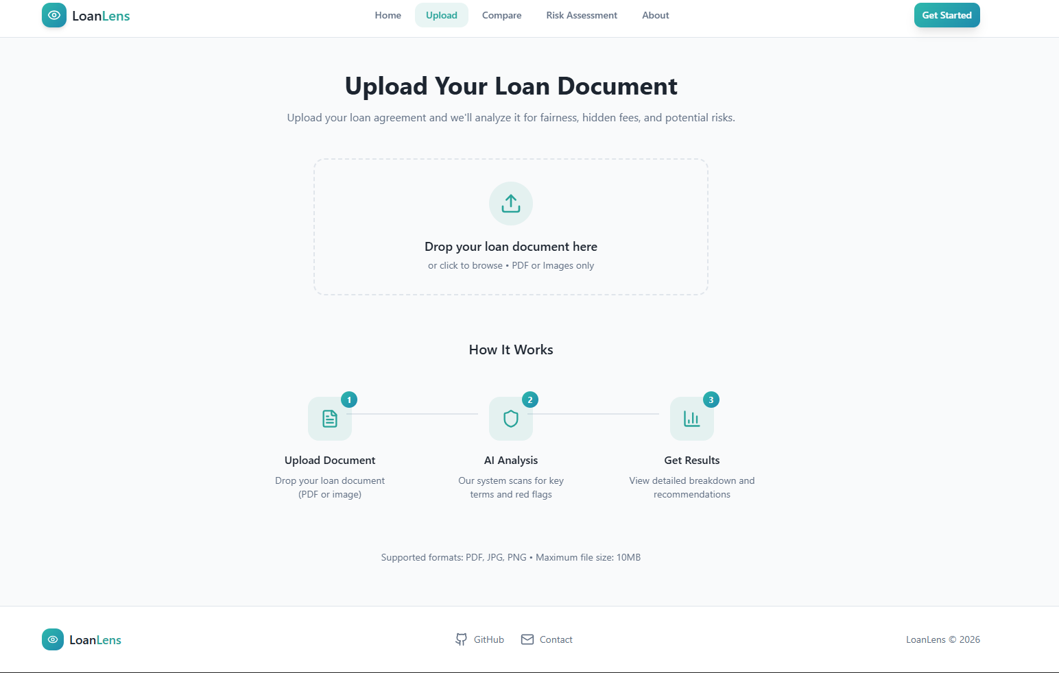 LoanLens is a multimodal AI auditor that translates dense legal jargon into plain truth. Users can upload PDFs or snap photos of loan papers at the desk. The system performs three core functions: