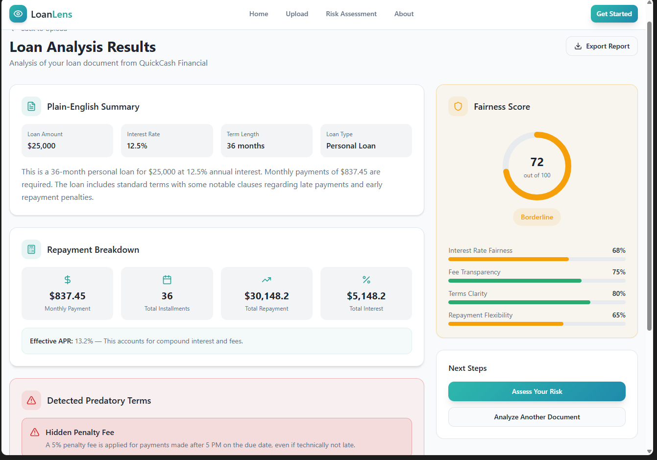 - Predictive Auditing: Flags "life-sucker" terms like 50% default interest hikes and hidden final payments.