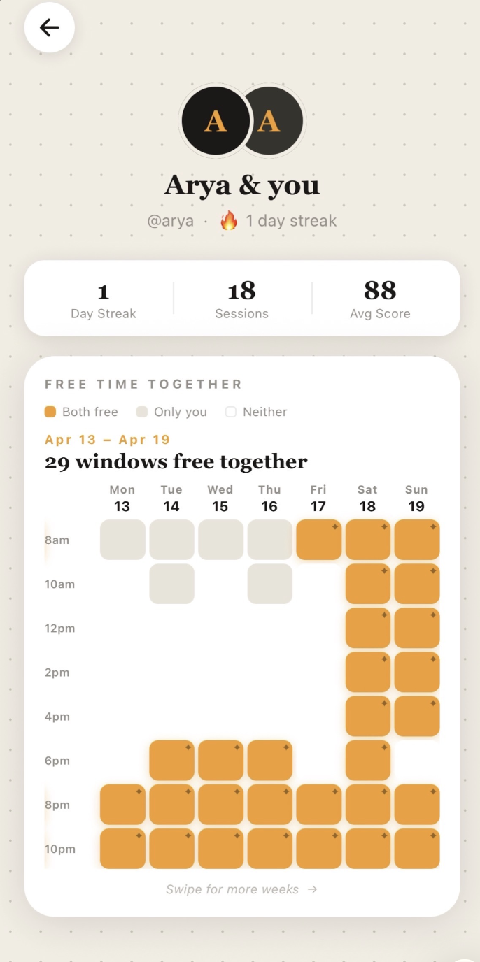 - Google Calendar mutual availability detection that surfaces a heatmap and sends a study invite in one tap