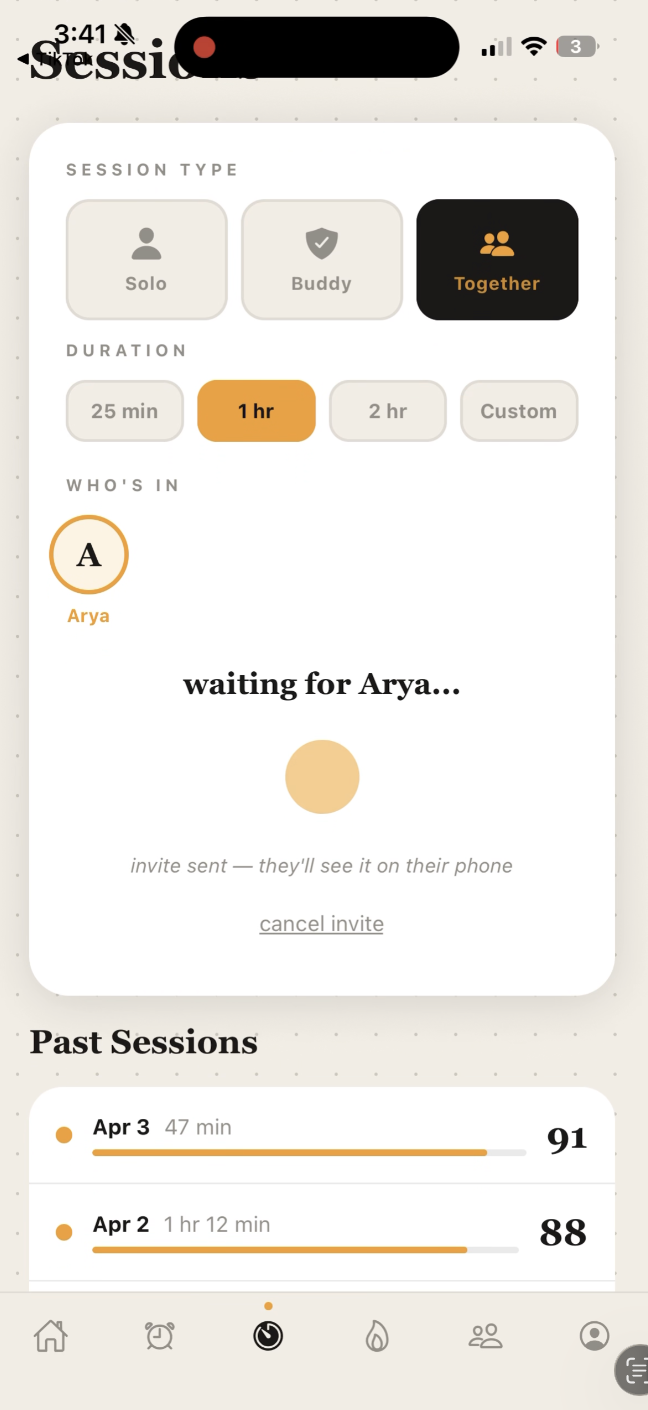 LockIn is a social accountability app that makes studying competitive, visible, and verified. AI alarm verification: your alarm won't stop until you photograph the right location. A custom on-device ML model verifies the photo in real time. No cheating with an online photo. Buddy mode: a friend watches your session live. The moment you leave the app to doomscroll, they get a push notification within 3 seconds. Together sessions: study with friends on a shared live timer. If someone picks up their phone, everyone knows. Social feed: sessions, streaks, and milestones auto-post to your circle. Live leaderboard: weekly rankings updated after every session. Calendar heatmap: Google Calendar syncs automatically to surface mutual free time across your friend group. One tap to invite to a meeting. Streak tracking: daily accountability built into your profile and feed.