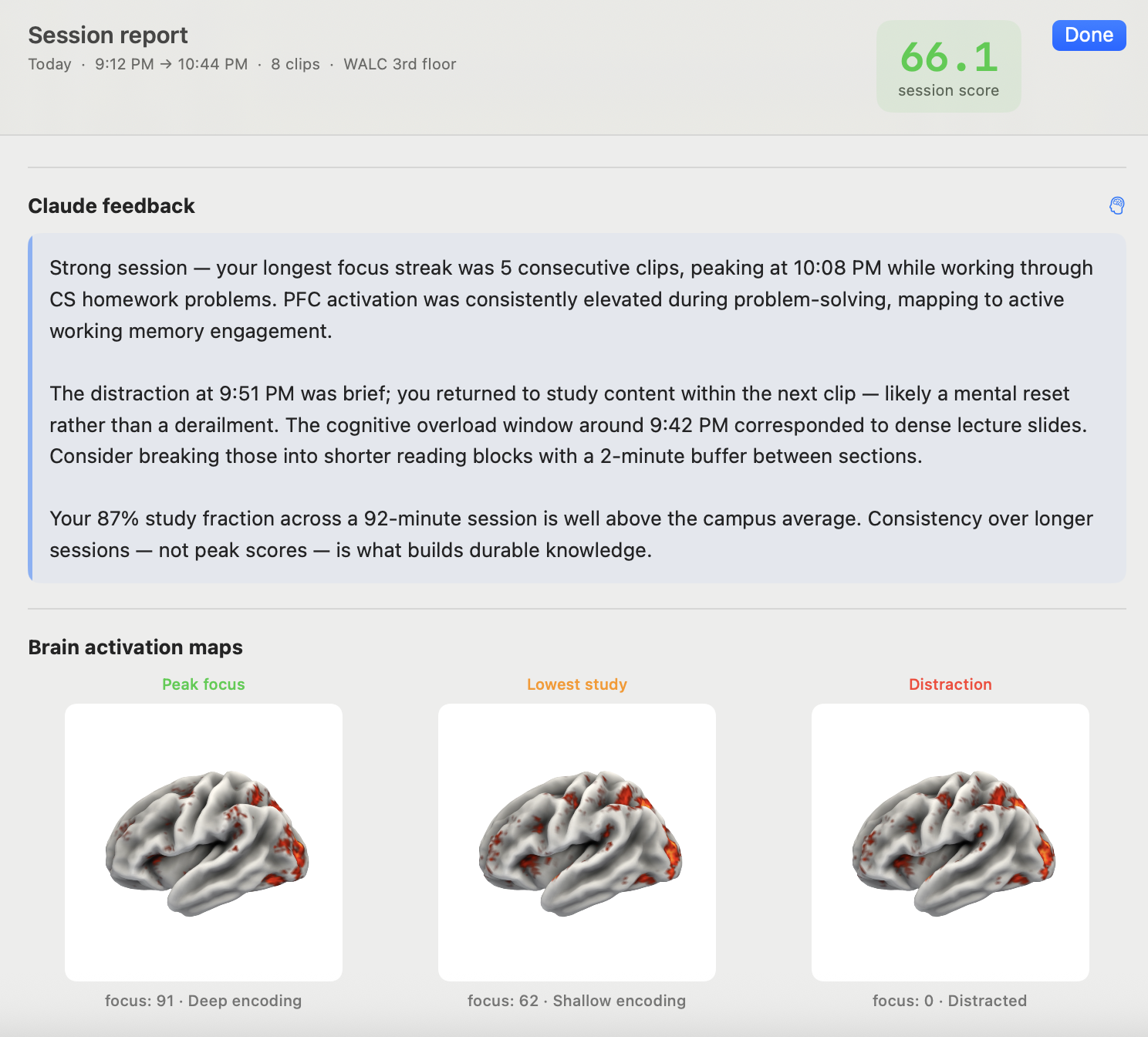 - Brain Activity Report -- Post-session insights on cognitive engagement and personalized study tips.