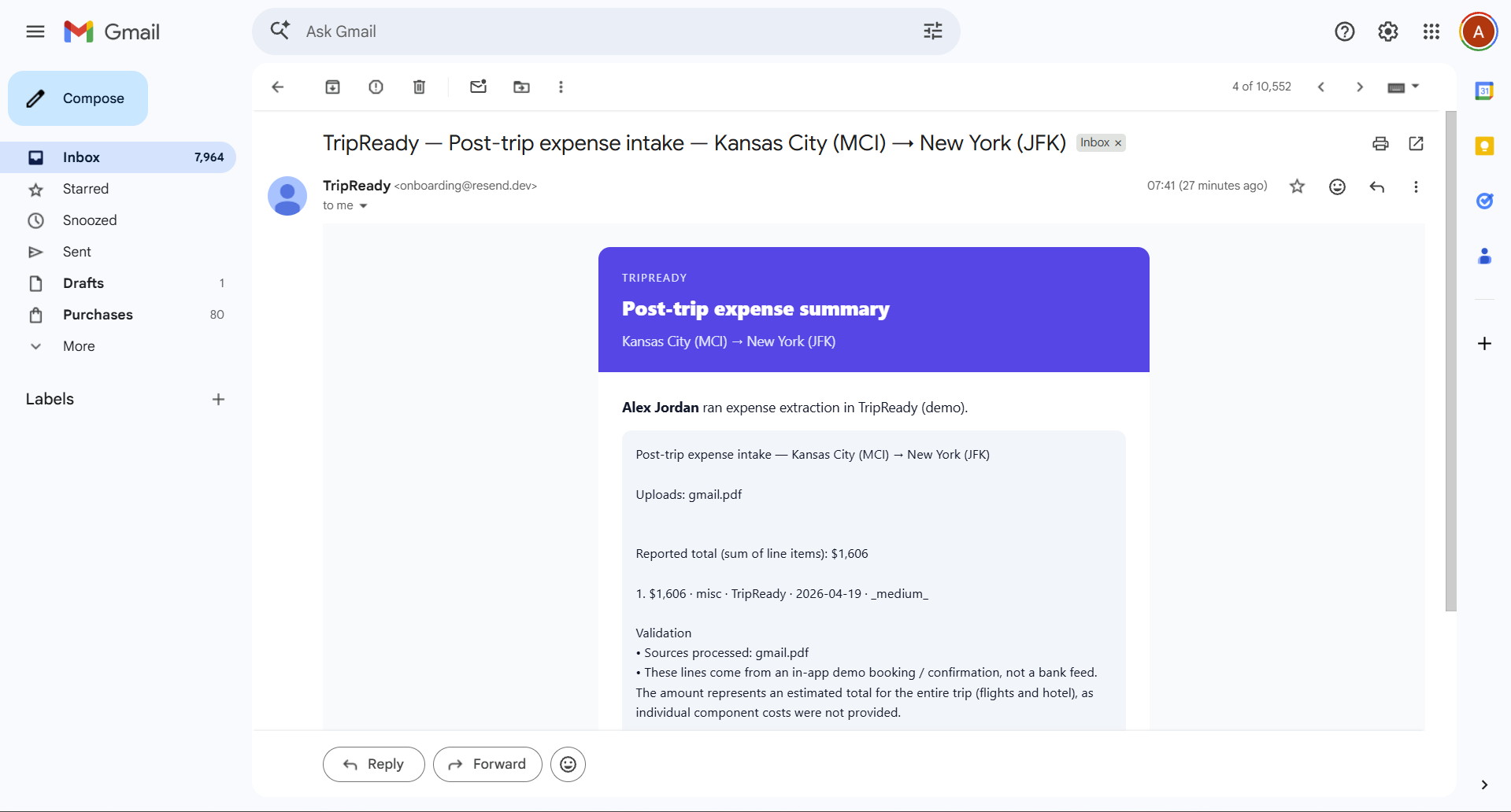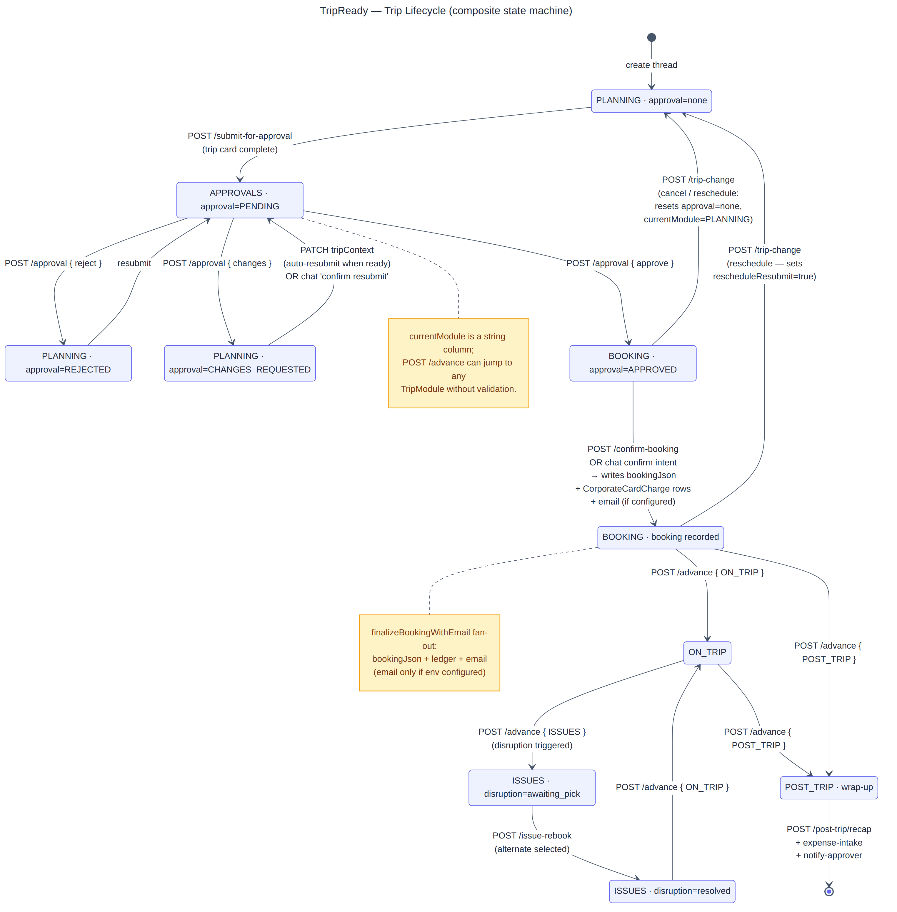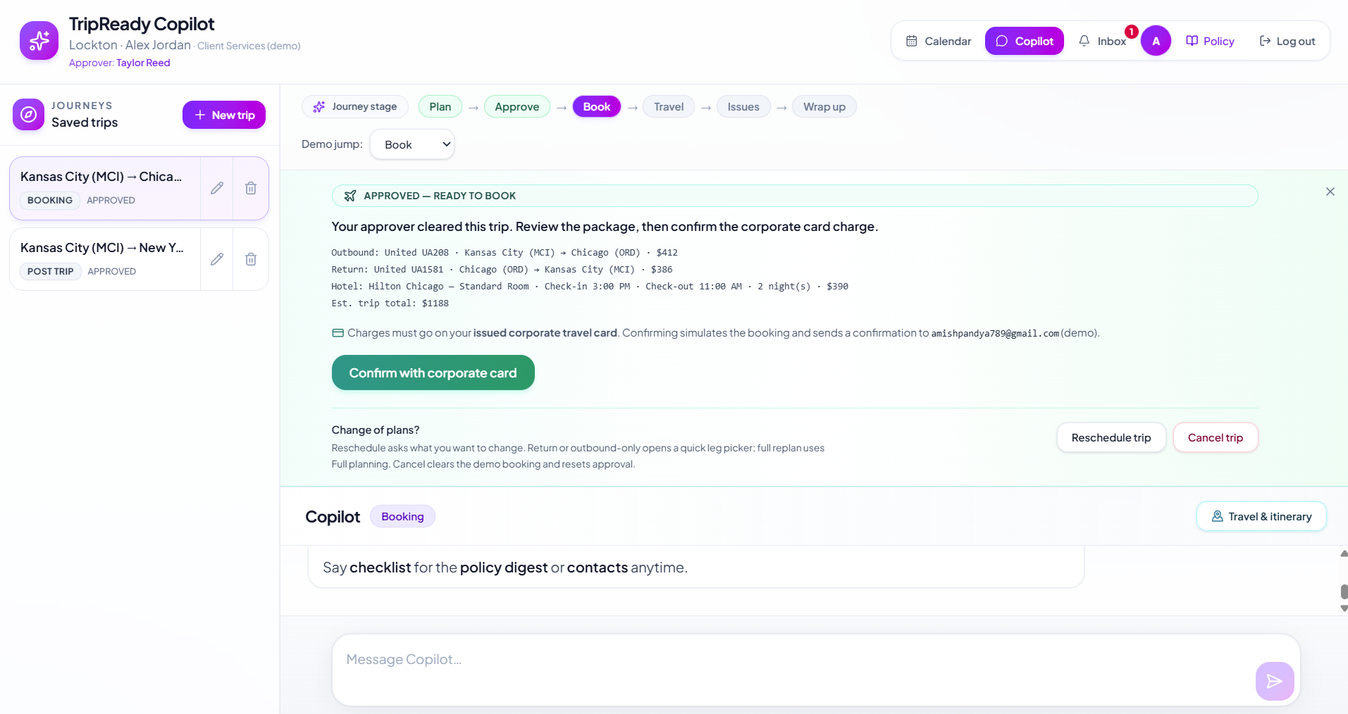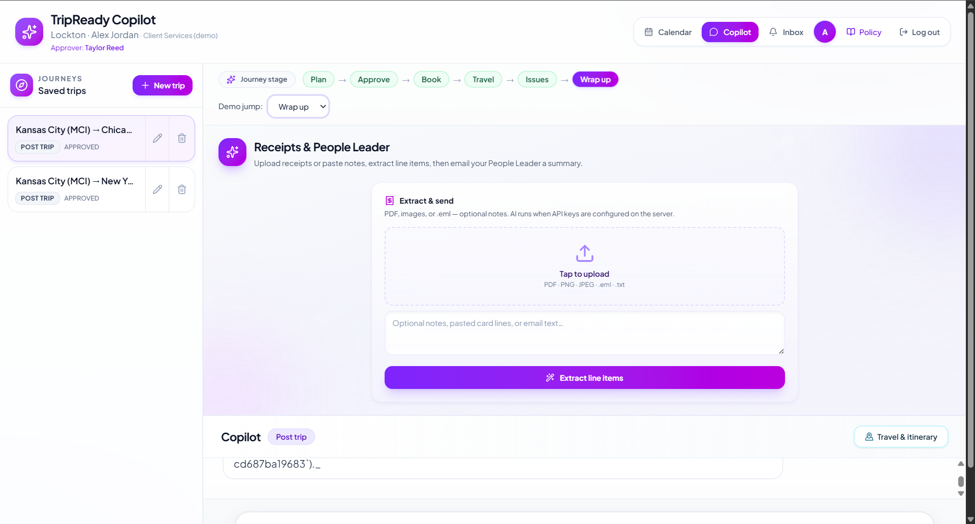 End-to-end demo arc: planning → approval → mock booking → ledger charges → post-trip recap and multipart receipt / .eml intake. Two real personas (traveler vs approver) with role-gated APIs and UI. Honest “simulated” labeling while still feeling polished (emails, confirmation codes, policy copy). Architecture you can explain: one Express surface, Prisma models, clear TripModule + approval axes.