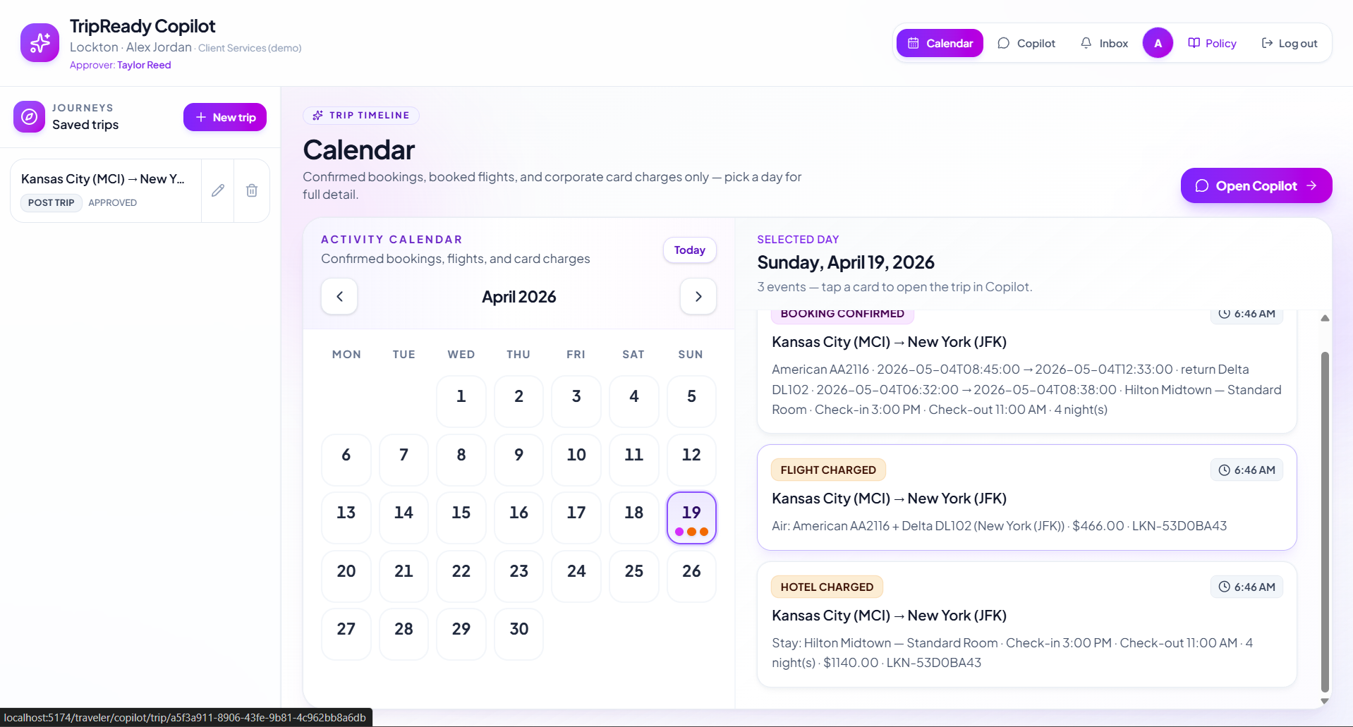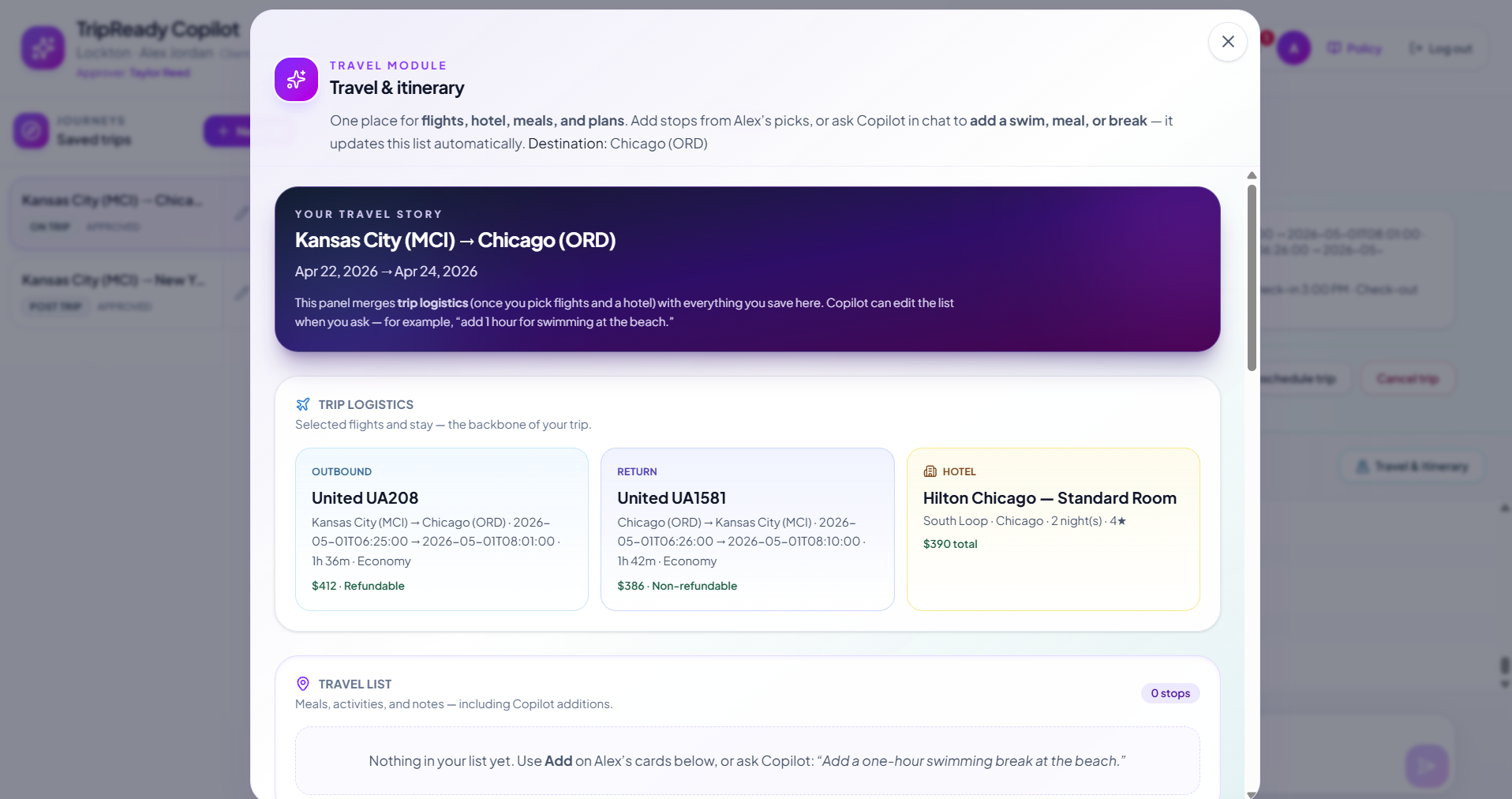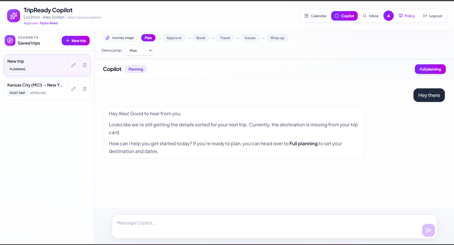 Corporate travel is fragmented: policy, approvals, booking, and what happens after the trip rarely feel like one flow. We wanted a single copilot-style thread that feels like a real associate journey—planning through wrap-up—with Lockton-flavored guardrails.