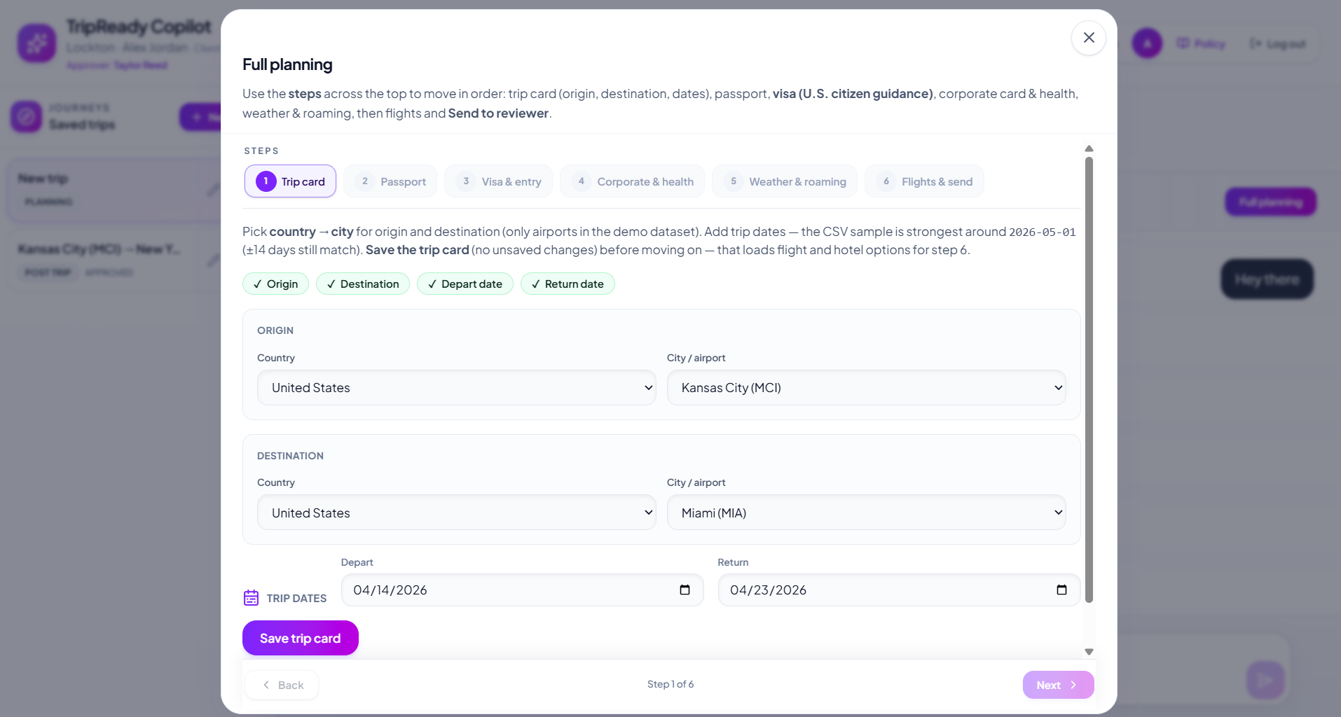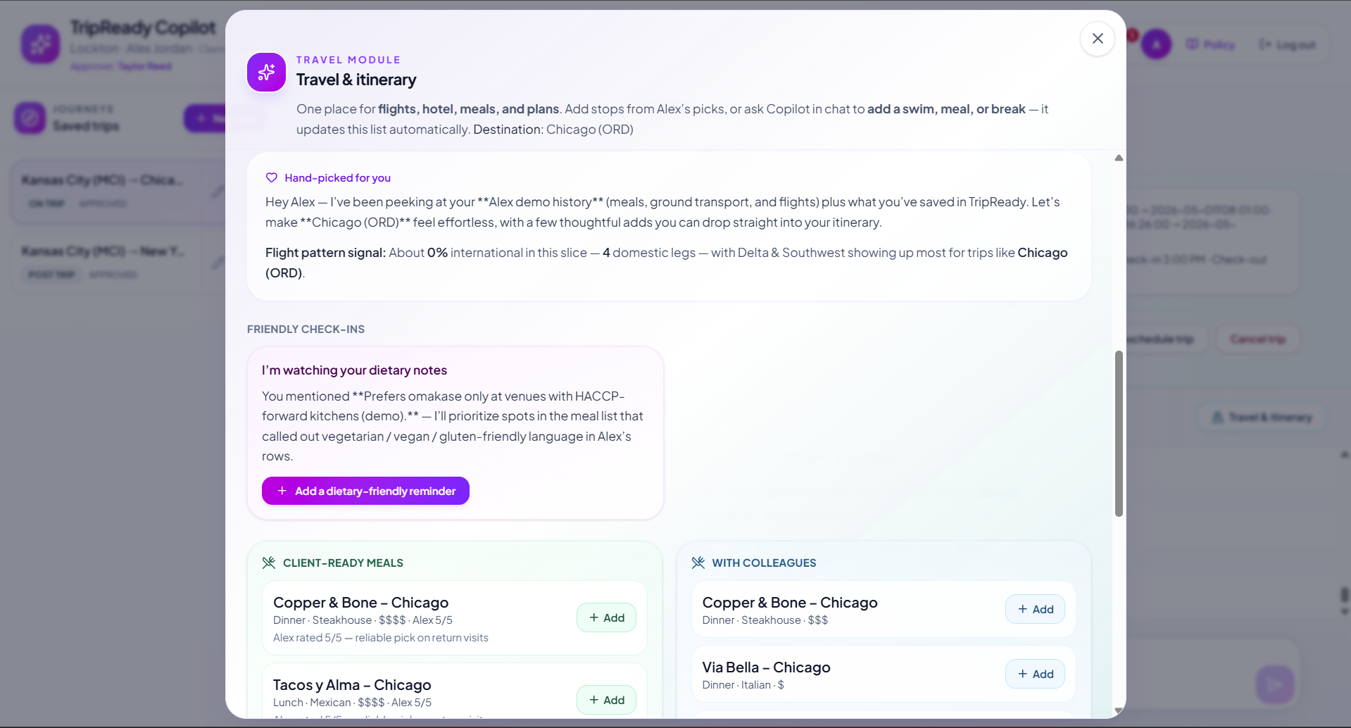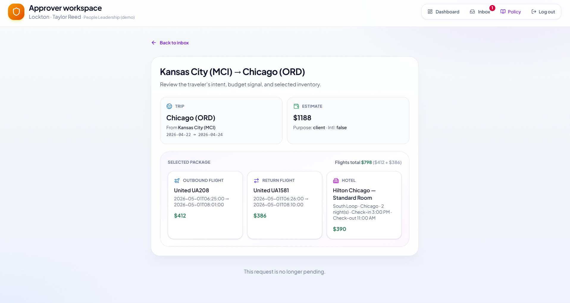 Corporate travel is fragmented: policy, approvals, booking, and what happens after the trip rarely feel like one flow. We wanted a single copilot-style thread that feels like a real associate journey—planning through wrap-up—with Lockton-flavored guardrails.