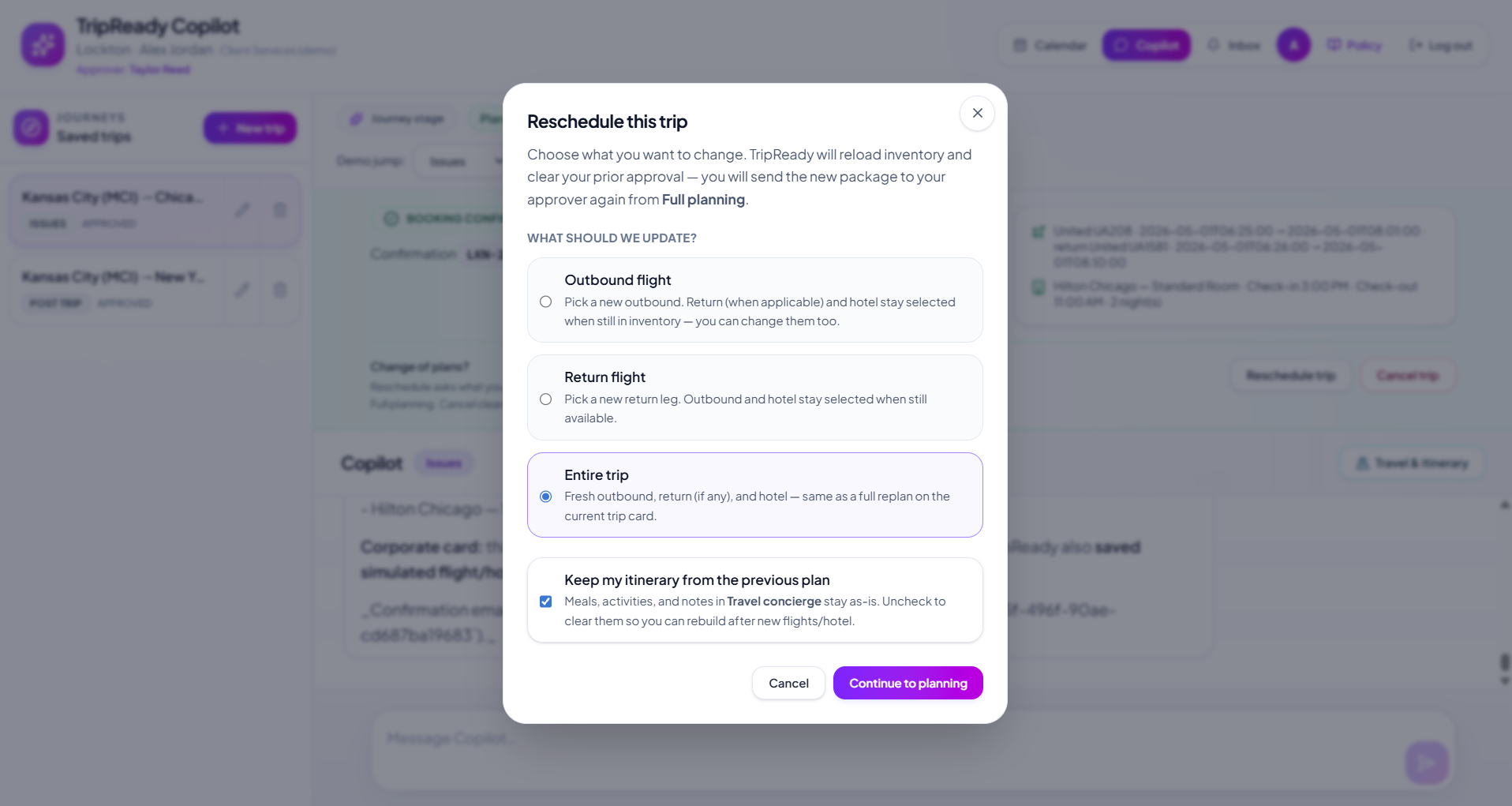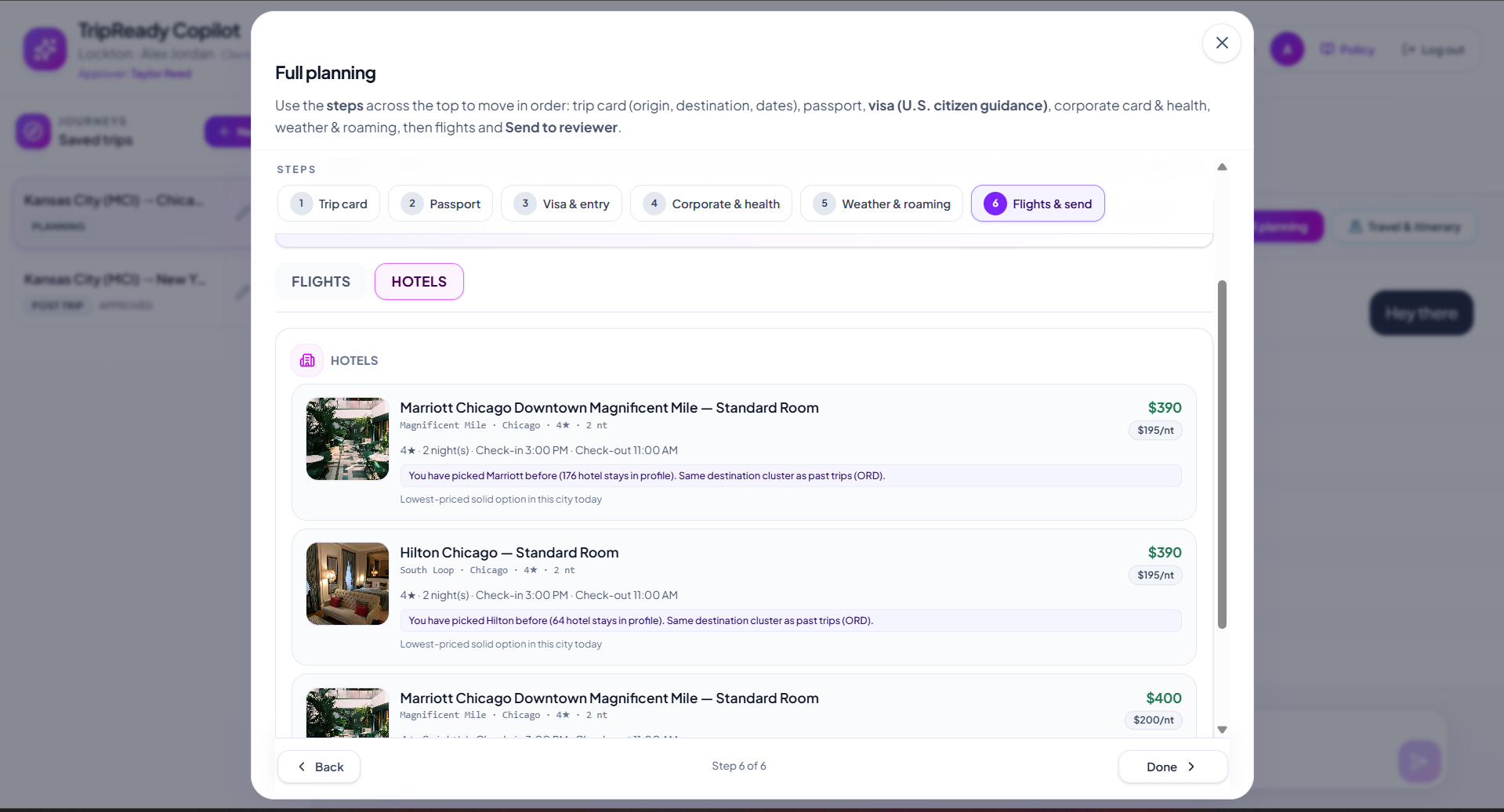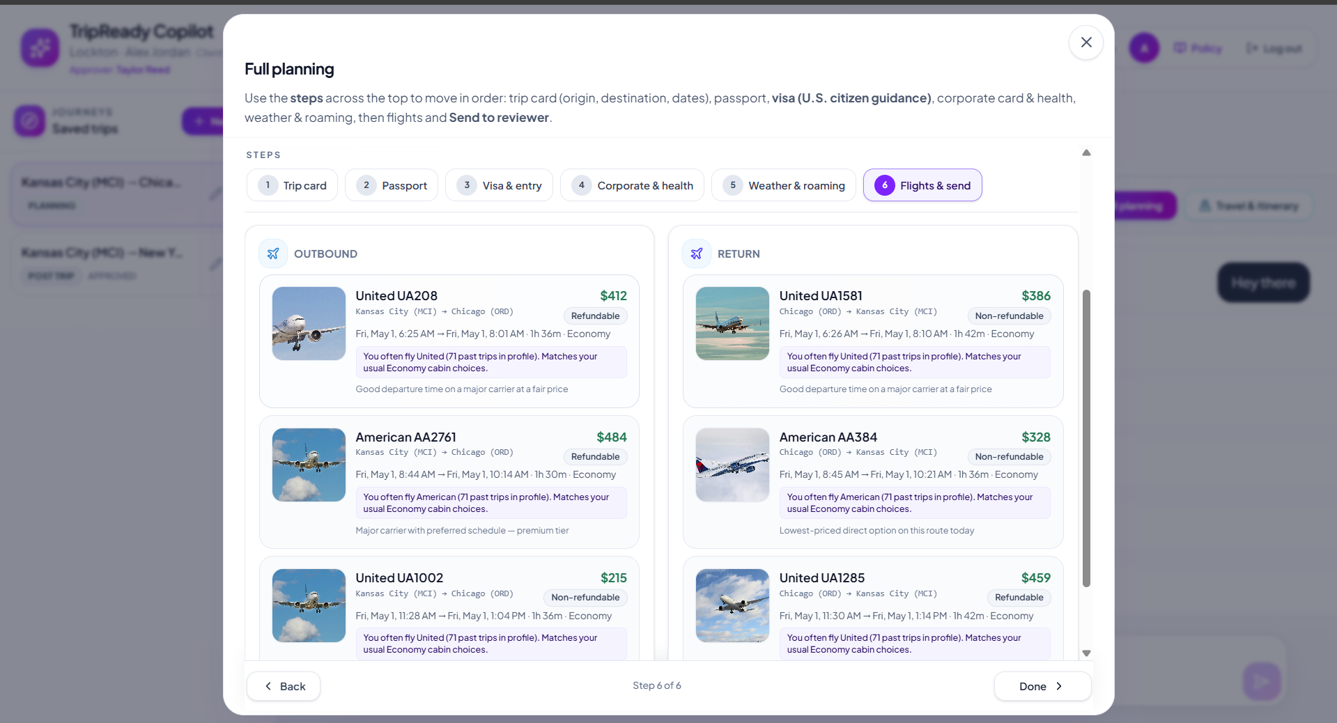 (1) Prompt: “I need a client meeting in Chicago from 2026-06-02 to 2026-06-04, flying out of Kansas City Monday morning and back Wednesday evening. Please propose flights and a hotel near the Loop.” Situation / response: Structured itinerary proposal with flight + hotel options from inventory; readiness to select one of each and submit for approval. Prompt: “Same Chicago trip — my People Leader prefers I keep total airfare under $800 round trip if possible. What still fits policy?” Situation / response: Refinement toward compliant options; ties to associate travel policy framing (budget / reasonableness), not generic travel advice.